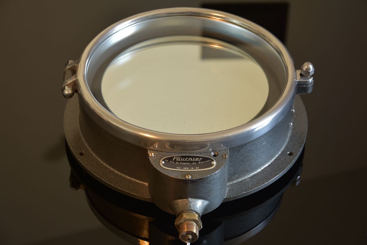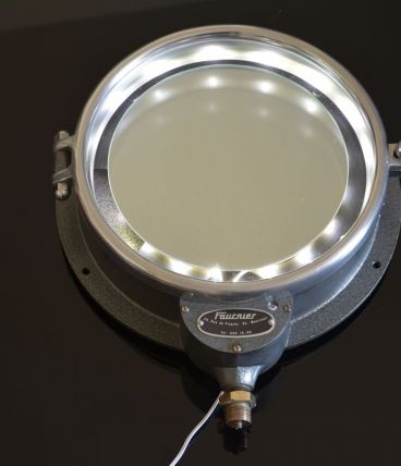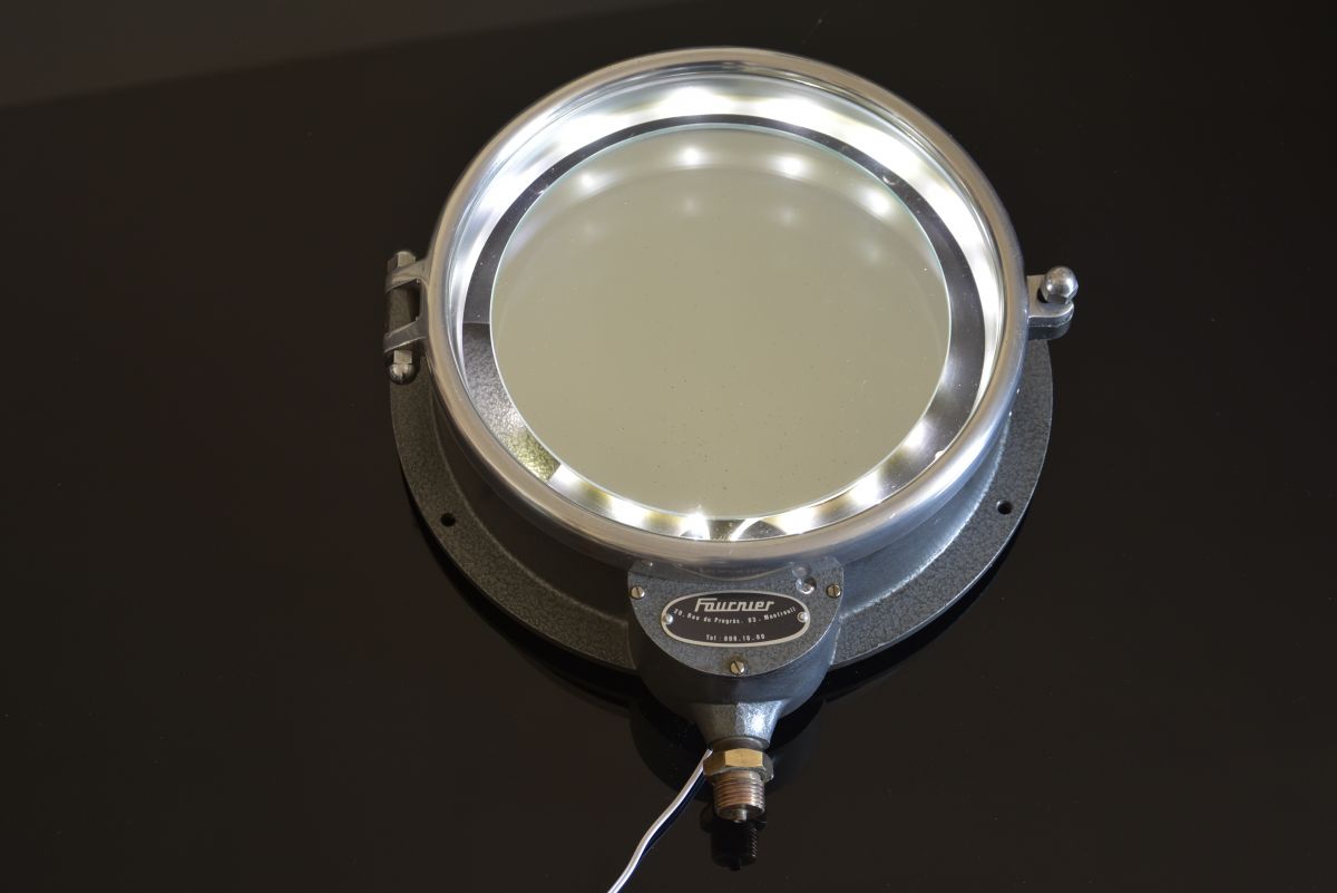 Lampe applique réalisée à partir d'un ancien instrument de mesure de pression hydraulique peut-être ,fabriquée en Angleterre entièrement en verre et métal , nous l'avons laissée dans son jus (traces d'usure et patine authentique) détournée en applique très originale qui rappelle les hublots de bateau, nous avons ajouté un miroir et un éclairage type bandeau led
