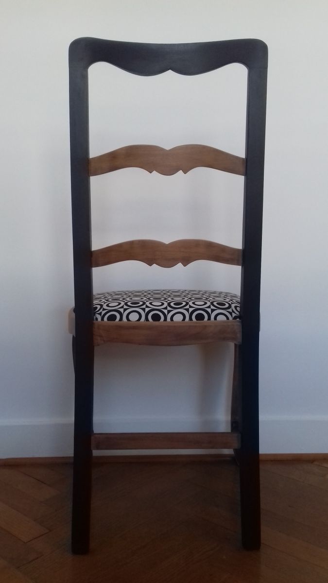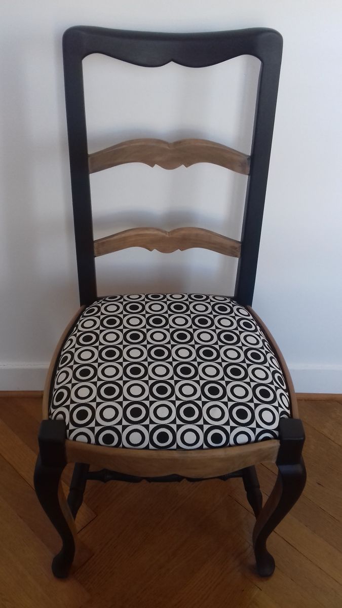 AVANT/APRES – Création Unique – Noir Mat et Bois Naturel Mat – Assise en mousse –Tissu graphique cercle – H 96 – Assise 44 x 42 – 4 exemplaires – 60 EUR l’unité - Photos supplémentaires détaillées sur demande