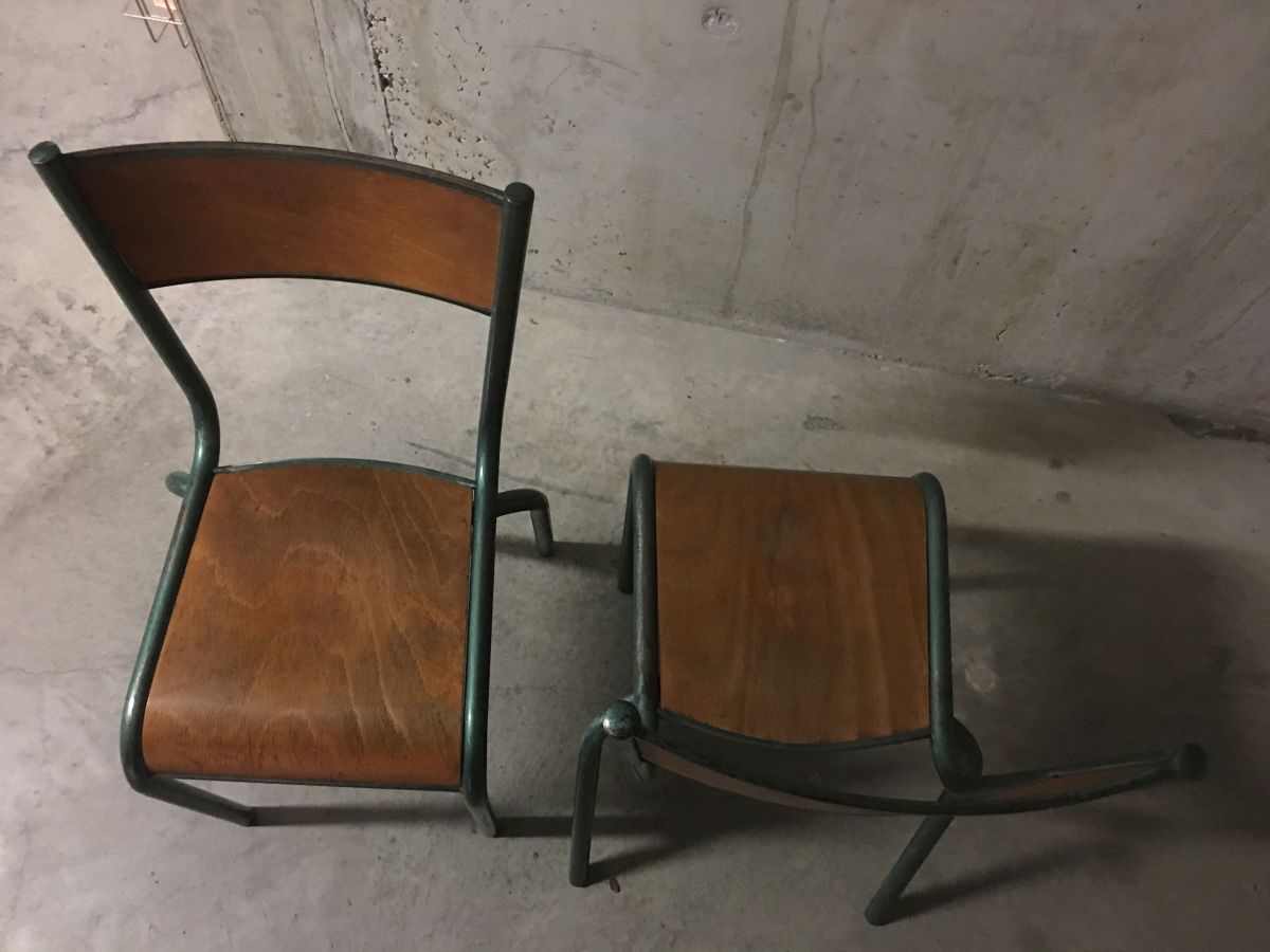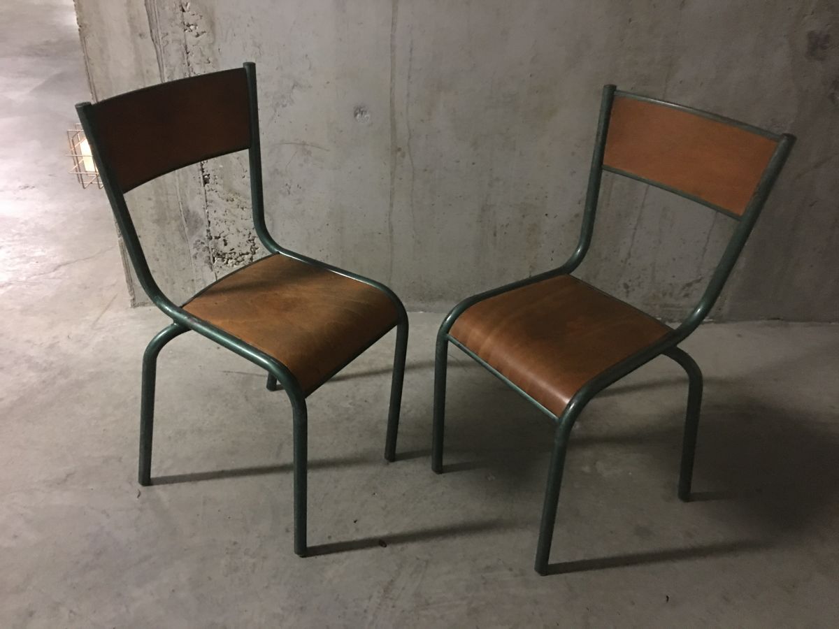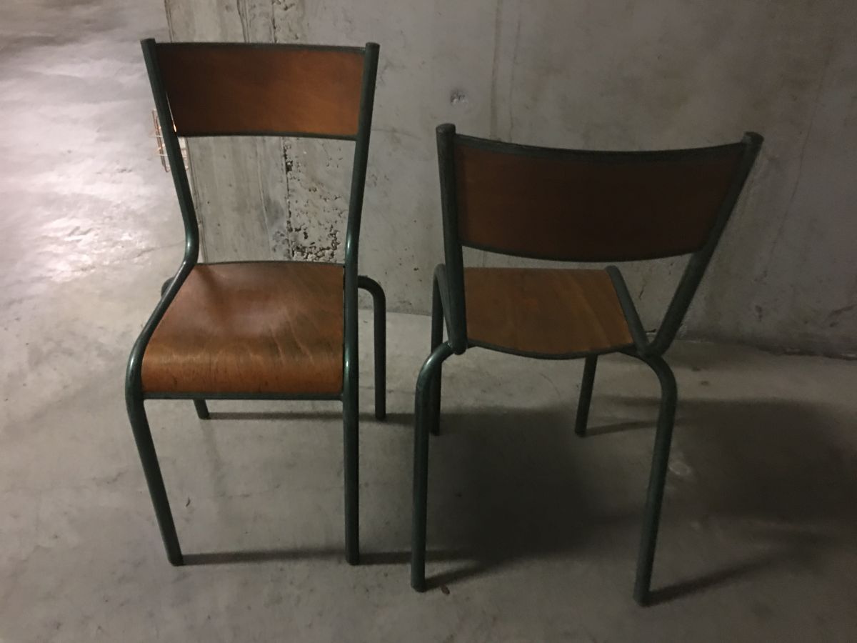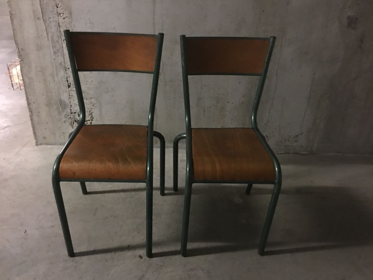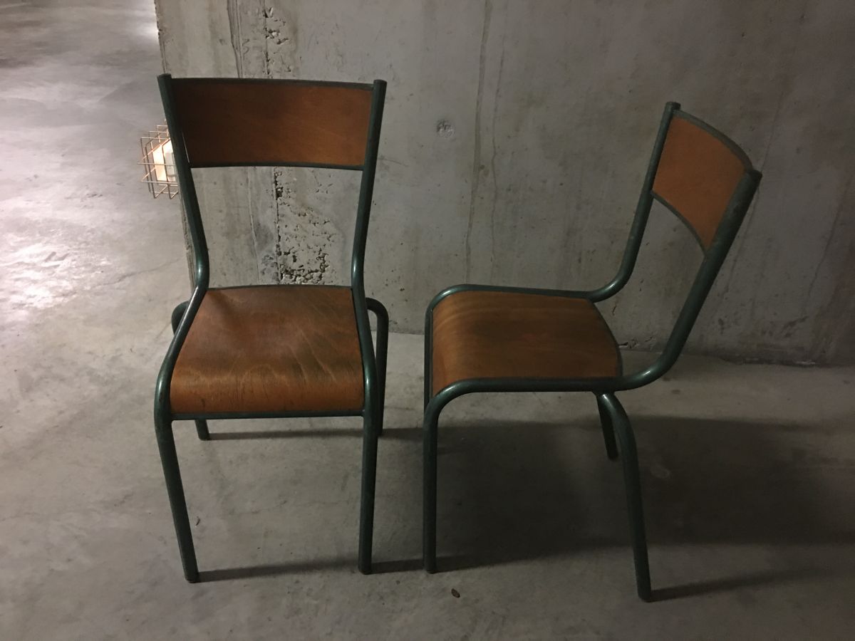 Paire de chaises d’écolier Mullca modèle 510, quelques traces d’usage normal sur l’assise et les montants et quelques légères inscriptions d’élèves d’époque (voir photos) qui contribuent au charme et au vécu des chaises, structure en métal tubulaire vert métallisé, hauteur totale 82cm, hauteur assise 45cm, assise 33x33cm, bon état.
