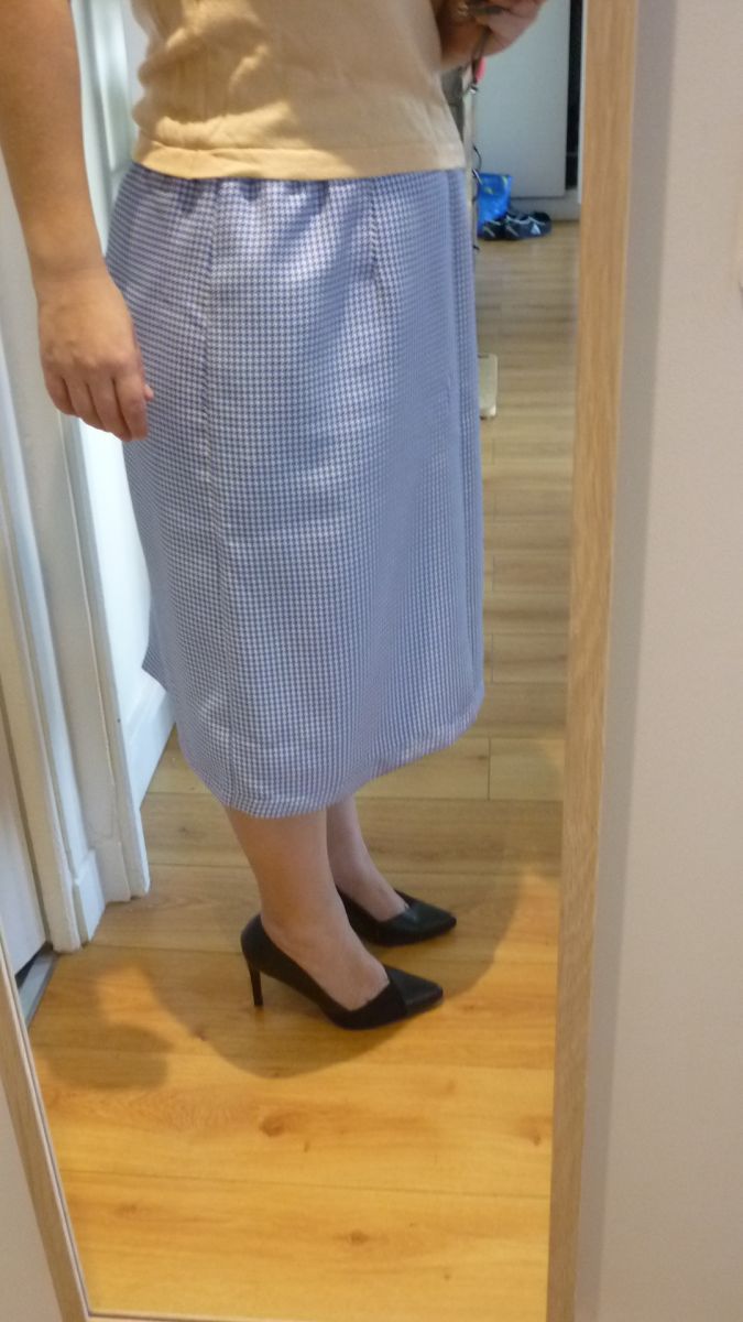 En très bon état à un tout petit accro fil tiré (voir photo c'est pourquoi j'ai mis bon état ) le reste de la jupe est nickel. mais ça ne se voit pas du tout une fois porté j 'ai du l inspecter en détail pour le trouver. taille élastique qui s"adapte la ma morphologie , arrière fendu pour faciliter les mouvements, jupe doublée. elle donne tout de suite du style, ça change du pied de poule noir et blanc, l'étiquette indique un 52 mais c est un 50
