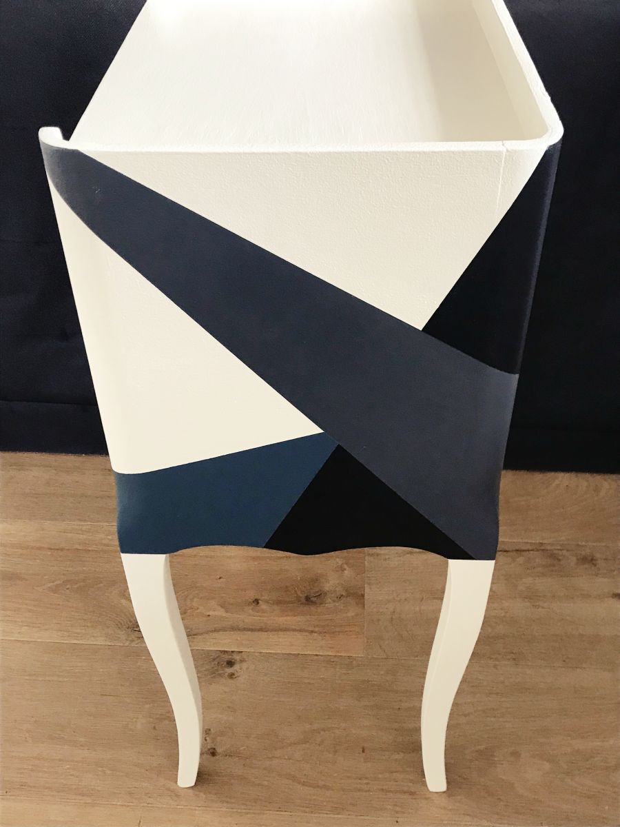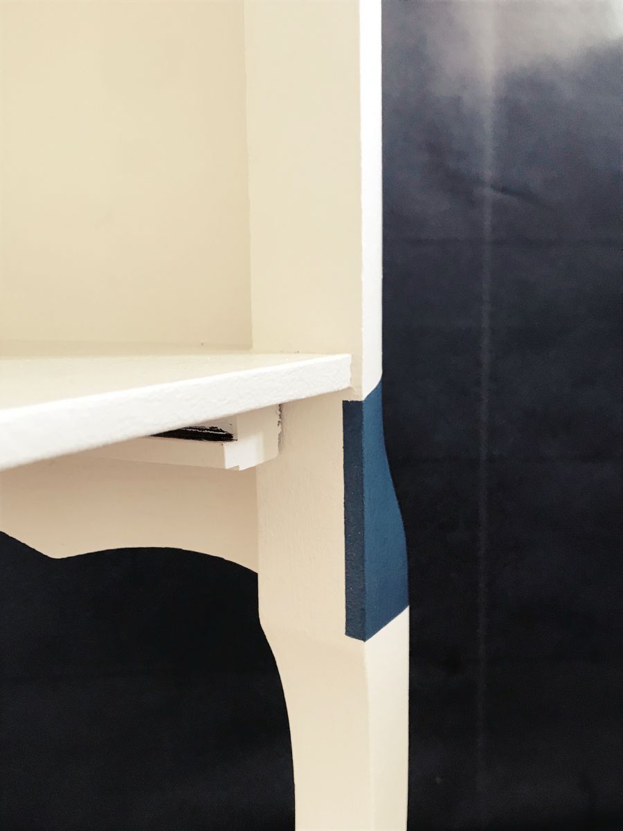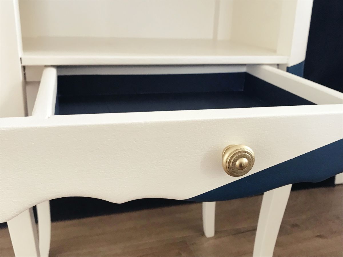 les détails : blanc milkshake, jeu de couleurs graphique noir, gris, bleu orage, intérieur du tiroir gris, couleur bouton or (d’origine)