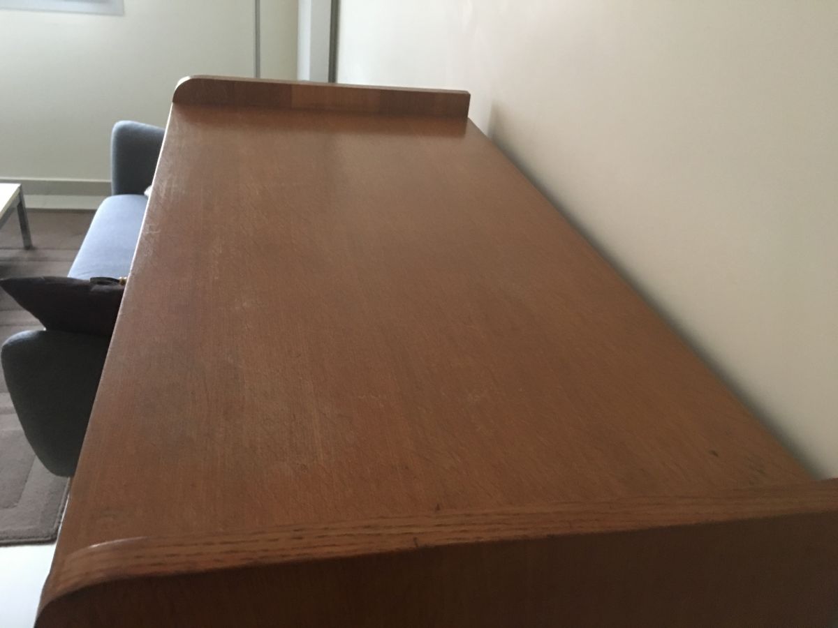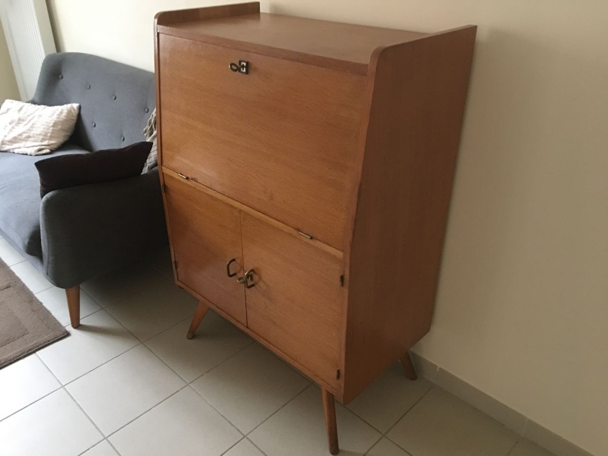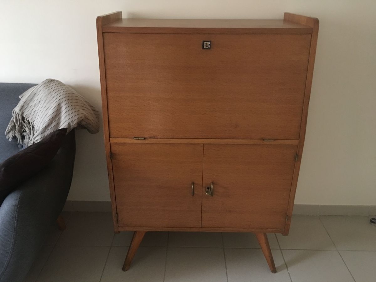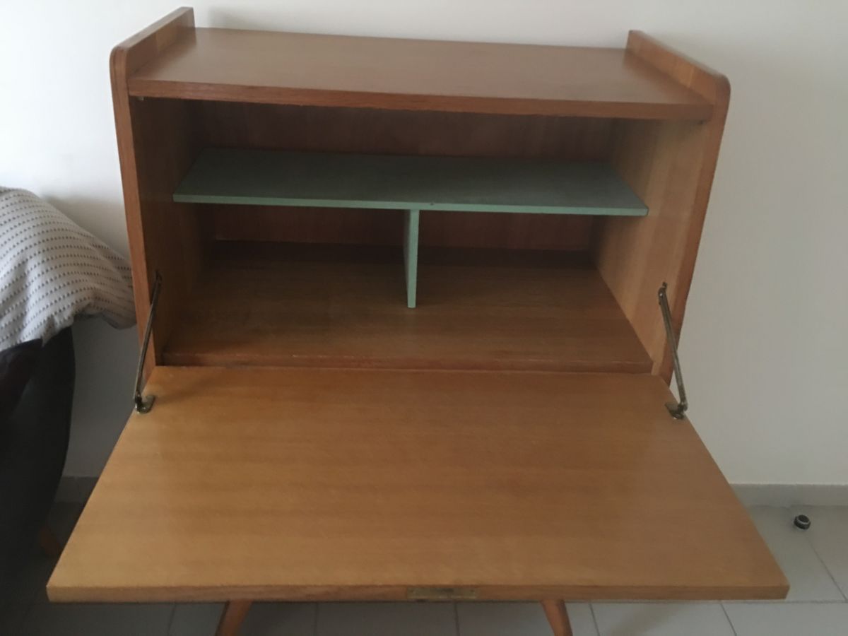 Superbe petit secrétaire en bois blond massif et placage des années 50, pieds compas, idéal petits espaces, dimensions (cm) : L.80xH.117xP.45, bon état.