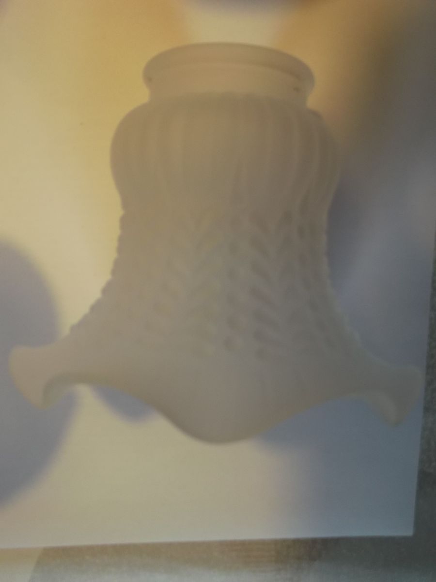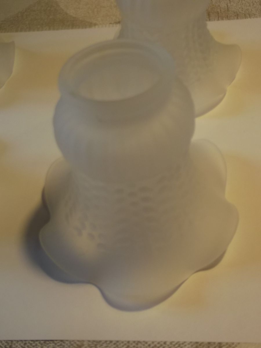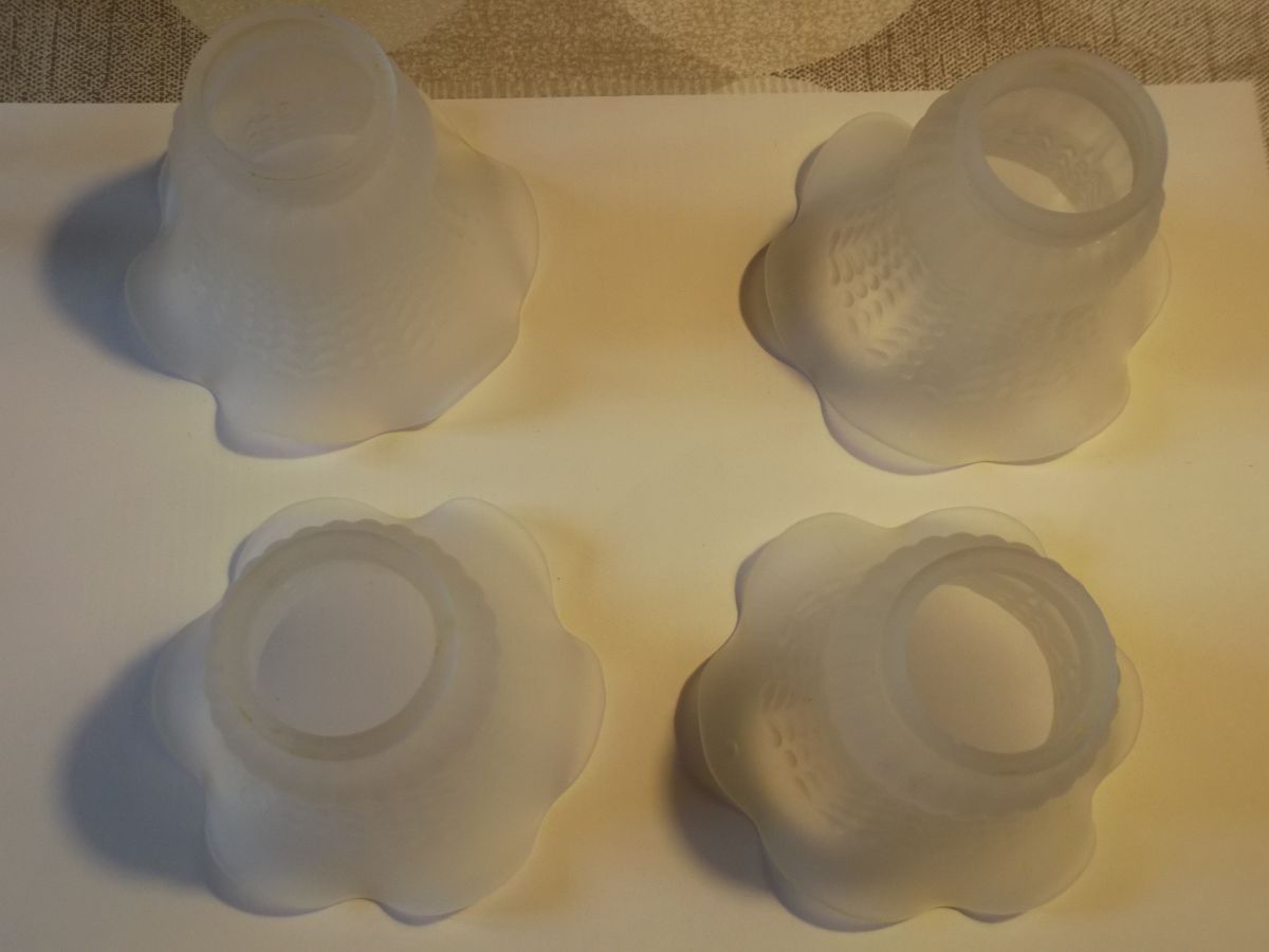 4 verres opaline forme fleurs pour luminaire. diamètre emplacement douille 4,5 cm et total avec rebords 5,5 cm, hauteur 11 cm, diamètre bas de fleur 13 cm, en très bon état, juste quelques petites tâches jaune (insectes) au niveau des douilles mais qui doivent s'enlever je n'ose pas frotter avec quel produit?! peur d'abimée...ensemble propre