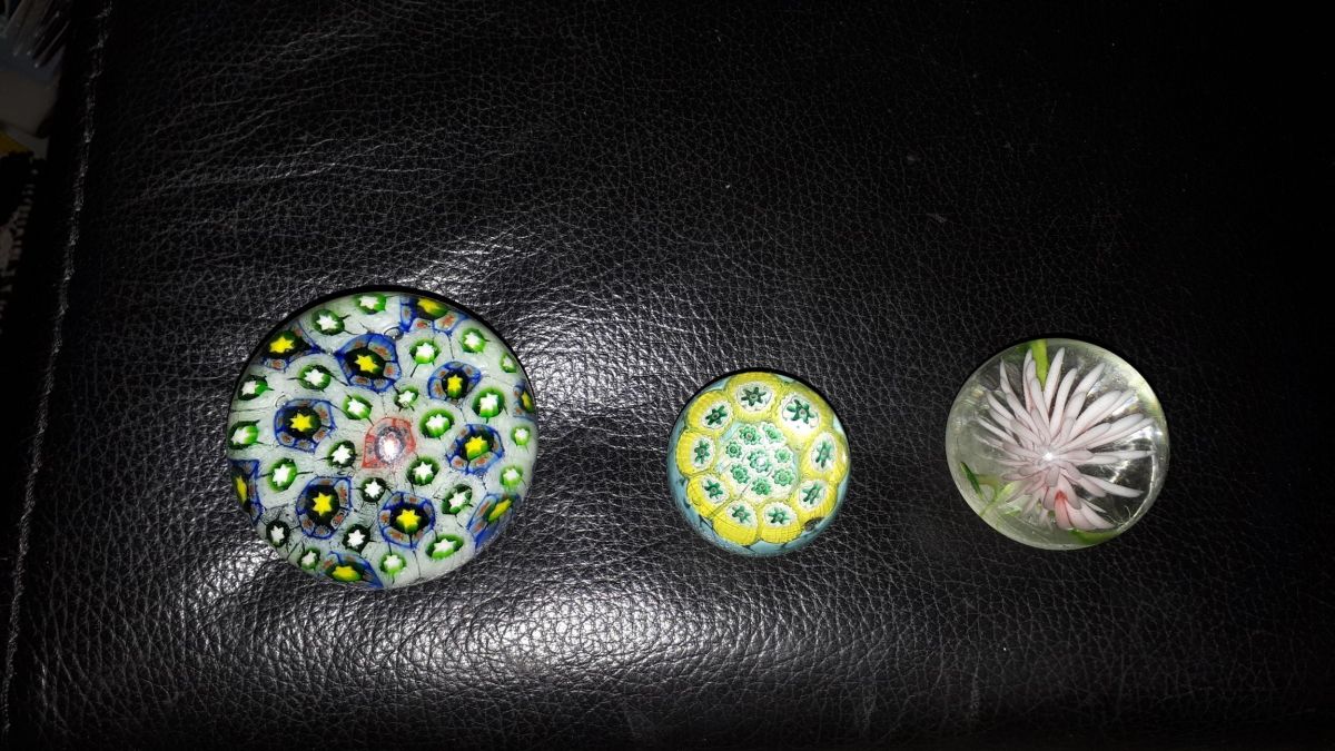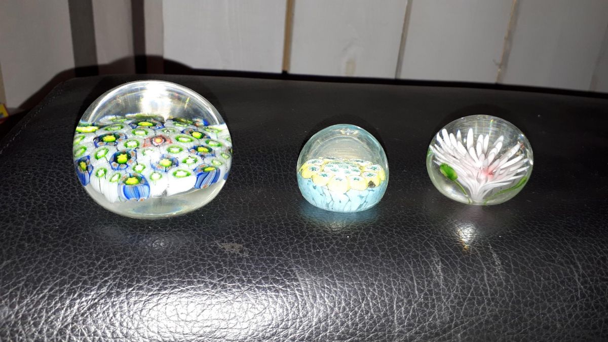 Lot de 3 petites décorations de bureau - demies spheres en verre avec des "fleurs" à l'interieur ou des décorations colorées