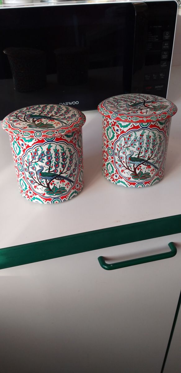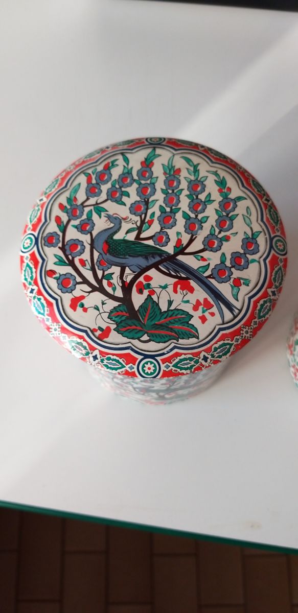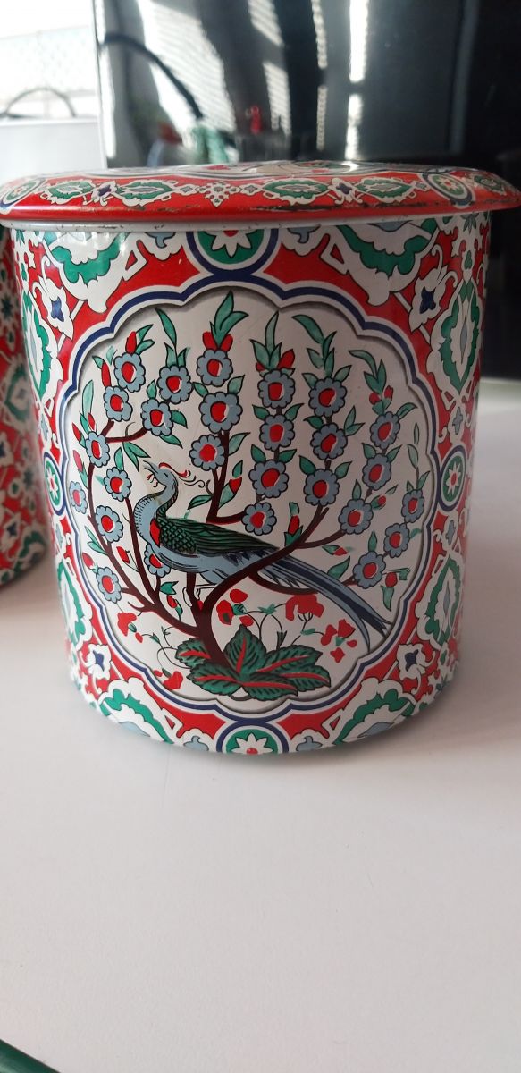 Lot de 2 boîtes cylindriques vintage avec très beau décor et des couleurs très vives.