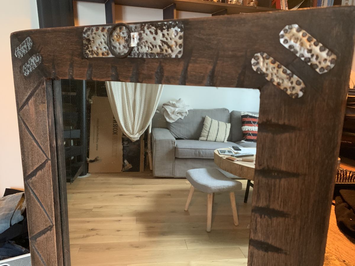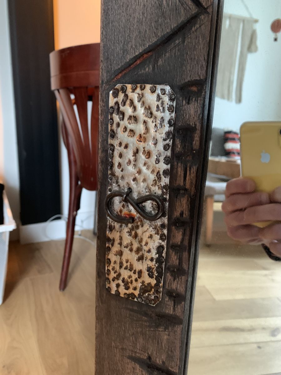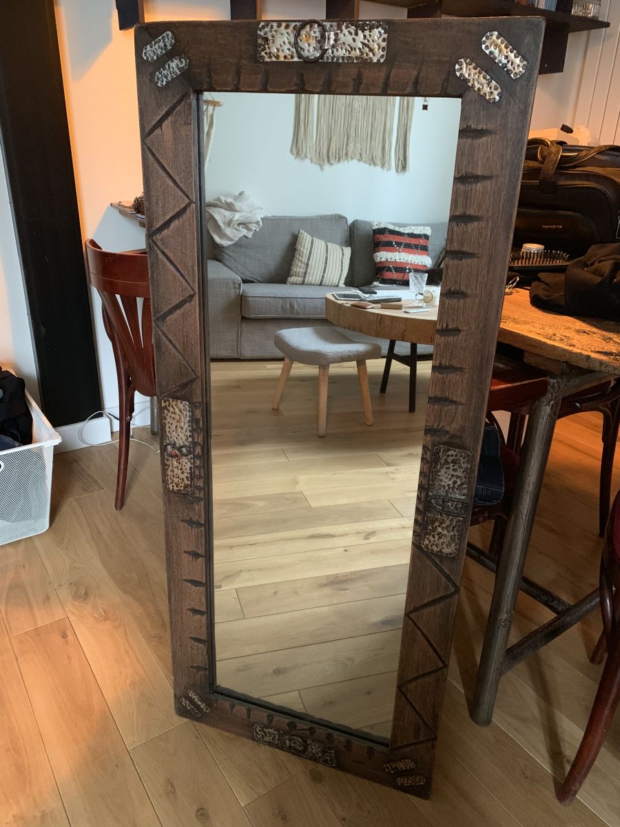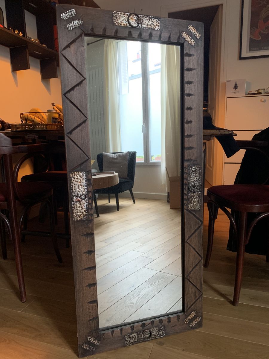 Beau miroir ancien en bois exotique et fer martèlé fait par un artisan en Cote d’ivoire. Attaches prévues pour le fixer à l’horizonrale. Ou tout simplement debout.