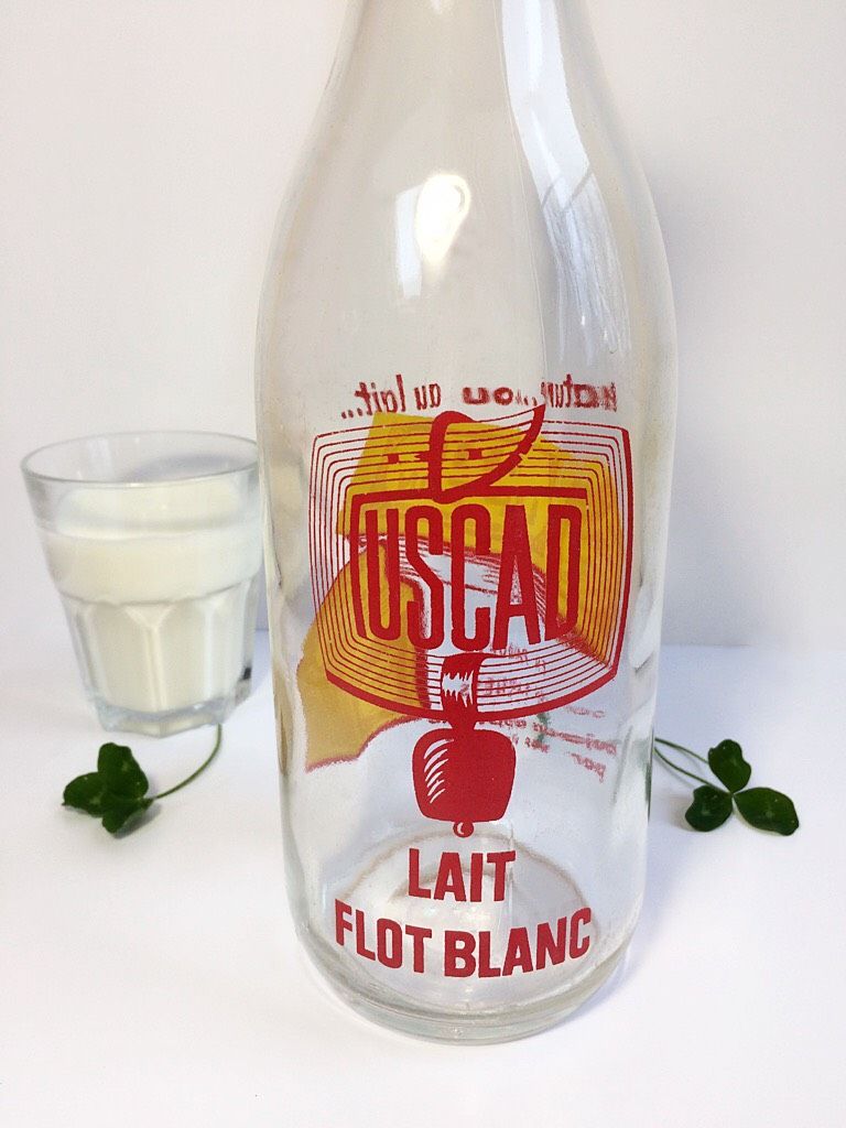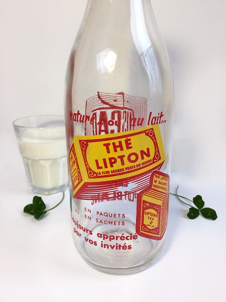bouteille de lait années 50 avec publicité "thé lipton" en rouge et jaune. Comporte une autre sérigraphie au verso avec le logo du fabricant "Uscad".