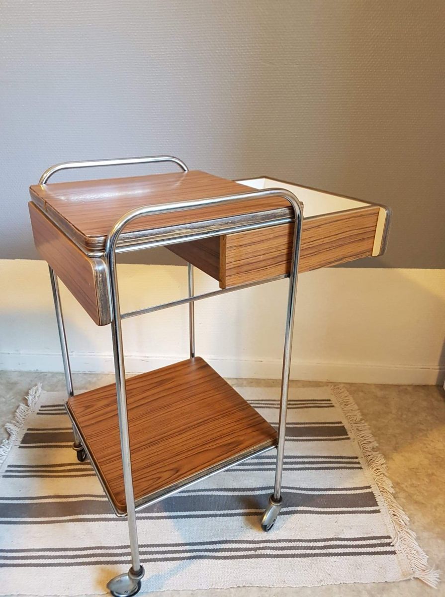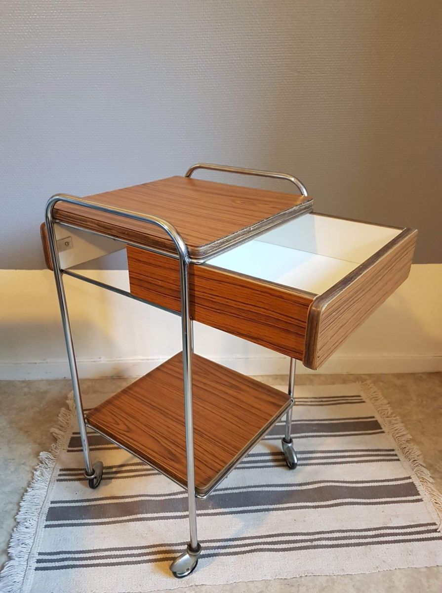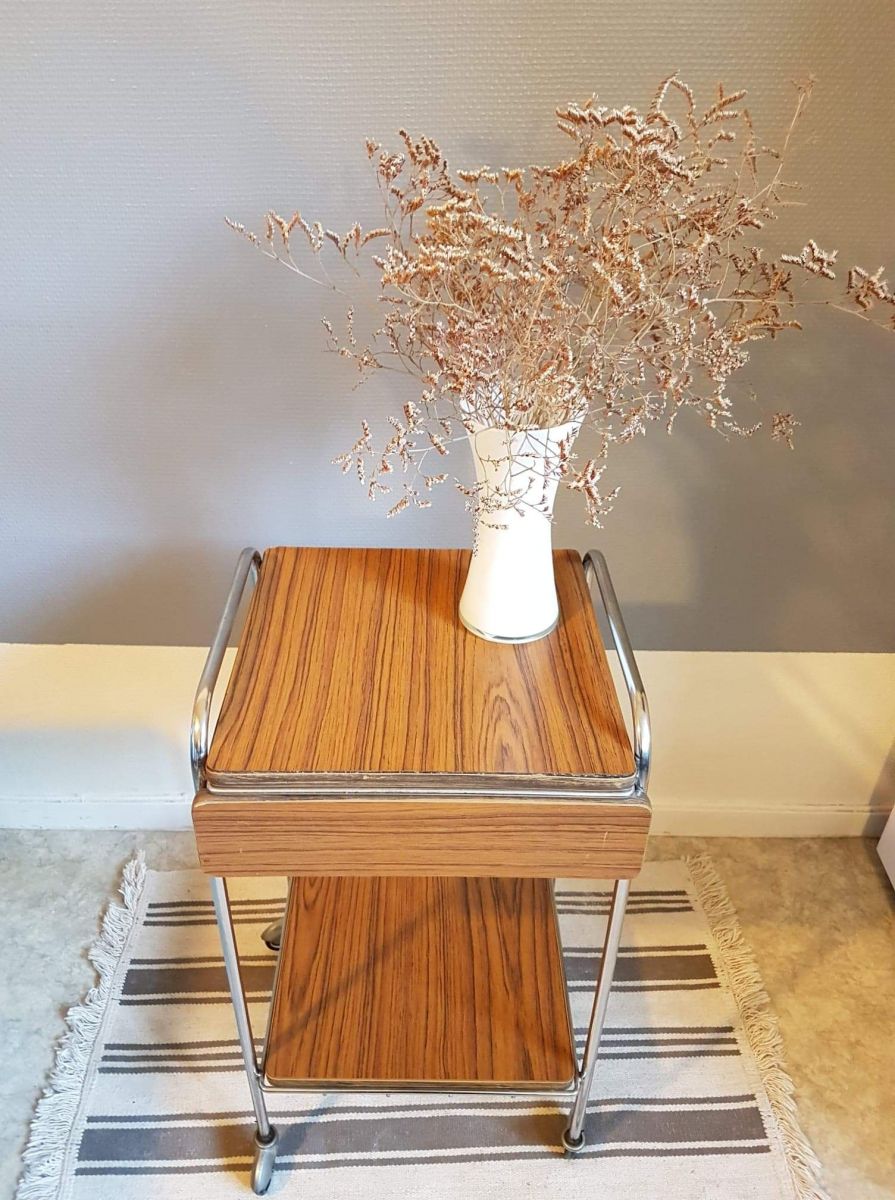 table de chevet en formica marron avec tiroir à roulettes des années 70 et plateau amovible
