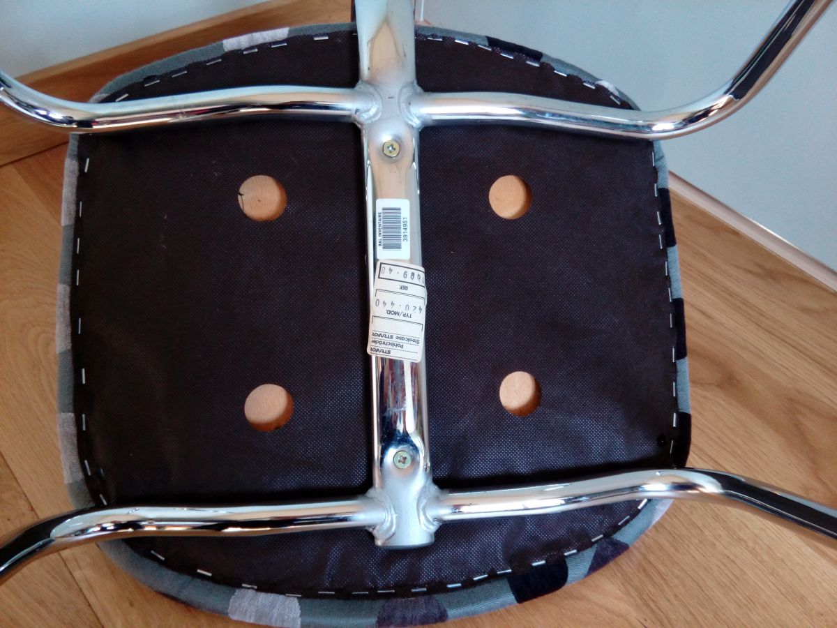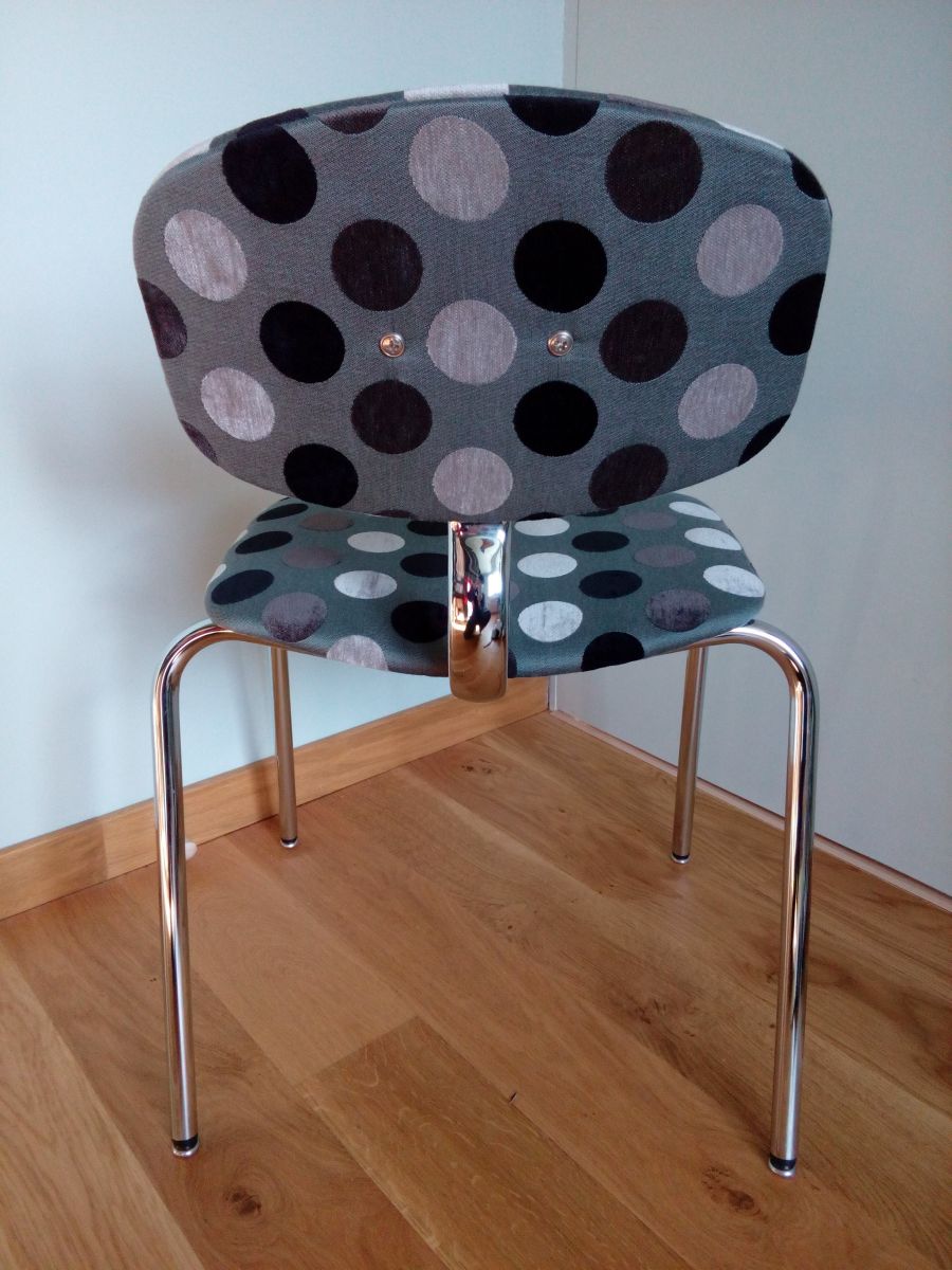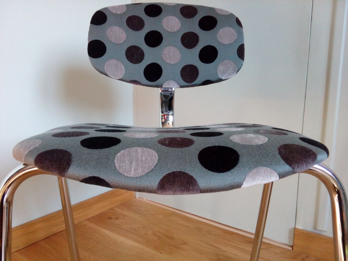 Cette chaise de la marque Steelcase Strafor est simplement magnifique ! Elle allie le confort à un design sobre et élégant, qui lui permettra à coup sûr de trouver sa place dans votre intérieur. La structure tubulaire est encore très solide, et le métal chromé n'est pas du tout piqueté. Le tissu d'origine n'étant plus très présentable, j'ai retapissé assise et dossier avec un tissu d'ameublement (neuf), au décor tout en rondeur, qui s'accorde bien avec les jolies courbes de cette chaise. Les pastilles sont de trois couleurs différentes (noir, gris clair, gris foncé tirant légèrement sur le chocolat selon l'angle de la lumière). Pastilles à effet velours au toucher, sur tissu plus lisse, plus ras de couleur grise (oui oui, c'est gris, et pas tirant sur le bleu comme les photos ont l'air de le faire penser ;) . Je ne suis pas tapissière professionnelle, mais je suis très contente du résultat de mon travail, c'est propre, pas de bourrelet. Les étiquettes Strafor sont encore présentes sous l'assise. Elle est en bon état, mais présente quand même quelques signes de son âge : une petite éraflure, peu visible, sur chacun des 2 pieds avant, et un léger balancement à vide, du au piétement un peu déformé, mais qui disparaît totalement quand on est assis dessus. L'assise mesure 42 cm de profondeur par 45 cm de largeur, et est à une hauteur d'environ 46 cm . La hauteur totale au niveau du dossier est de 77 cm. Ce siège pèse 5 kg environ.