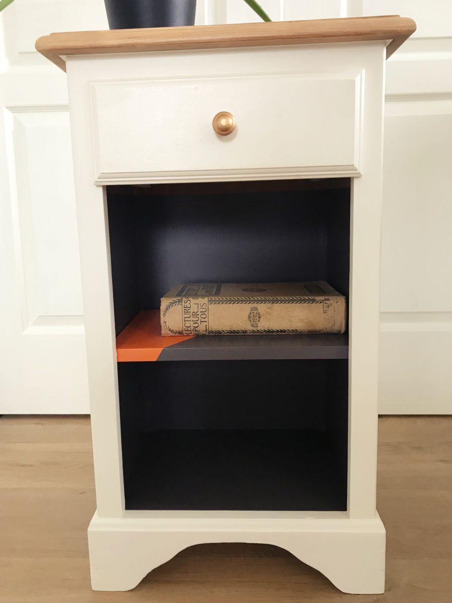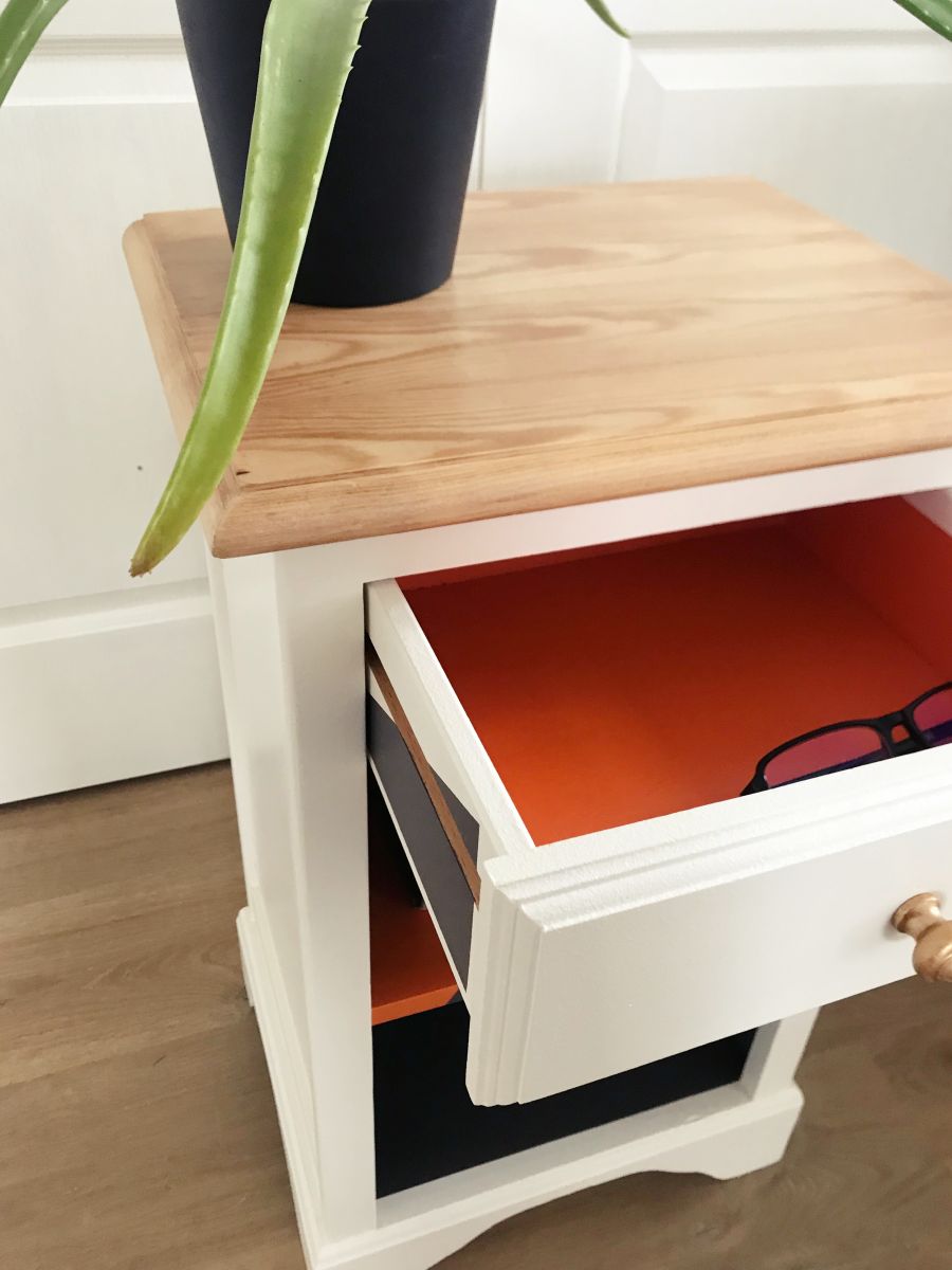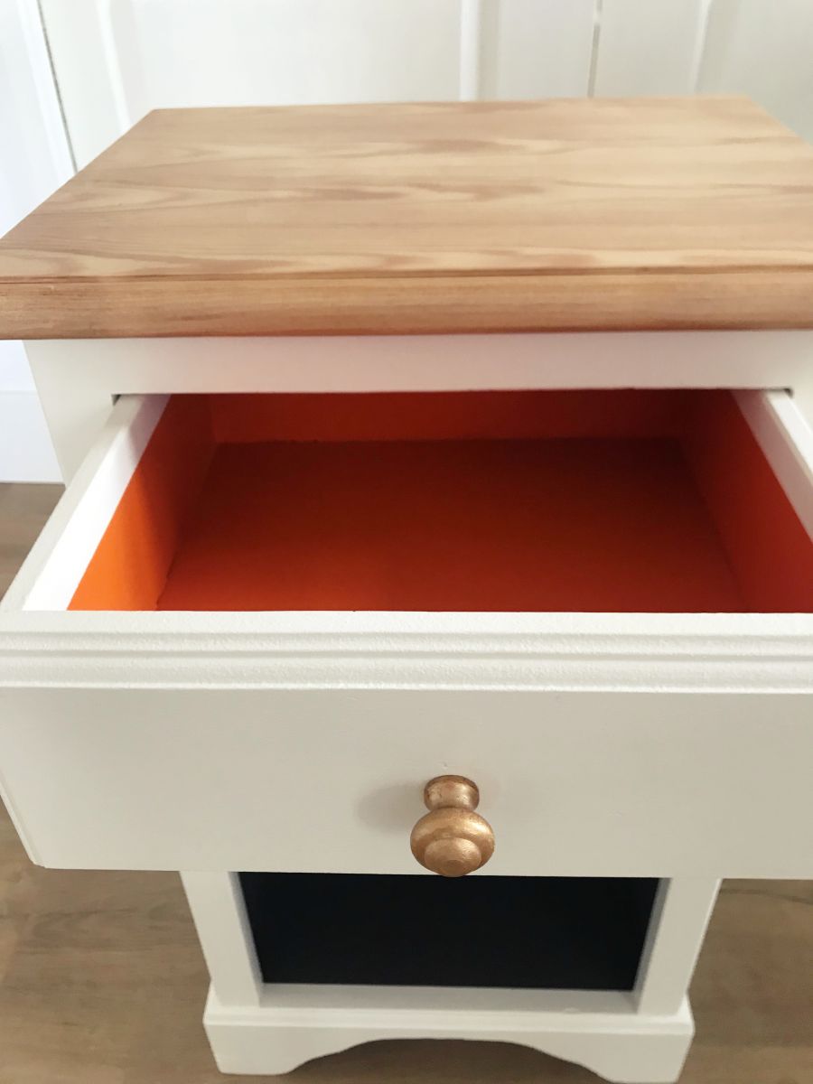 intérieur du tiroir orange pop avec rappel côté graphique, bouton d’origine vieil or