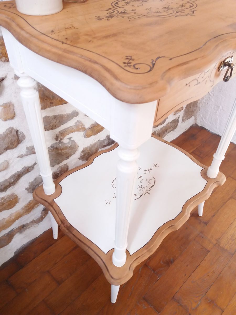 Pour jouer le contraste entre le bois naturel les pieds et le plateau du bas a été repeint en 2 étapes si on ne compte pas la sous-couche en peinture caséine Libéron cottonade puis en peinture Libéron chaulé ce qui donne la nuance de ce "blanc".