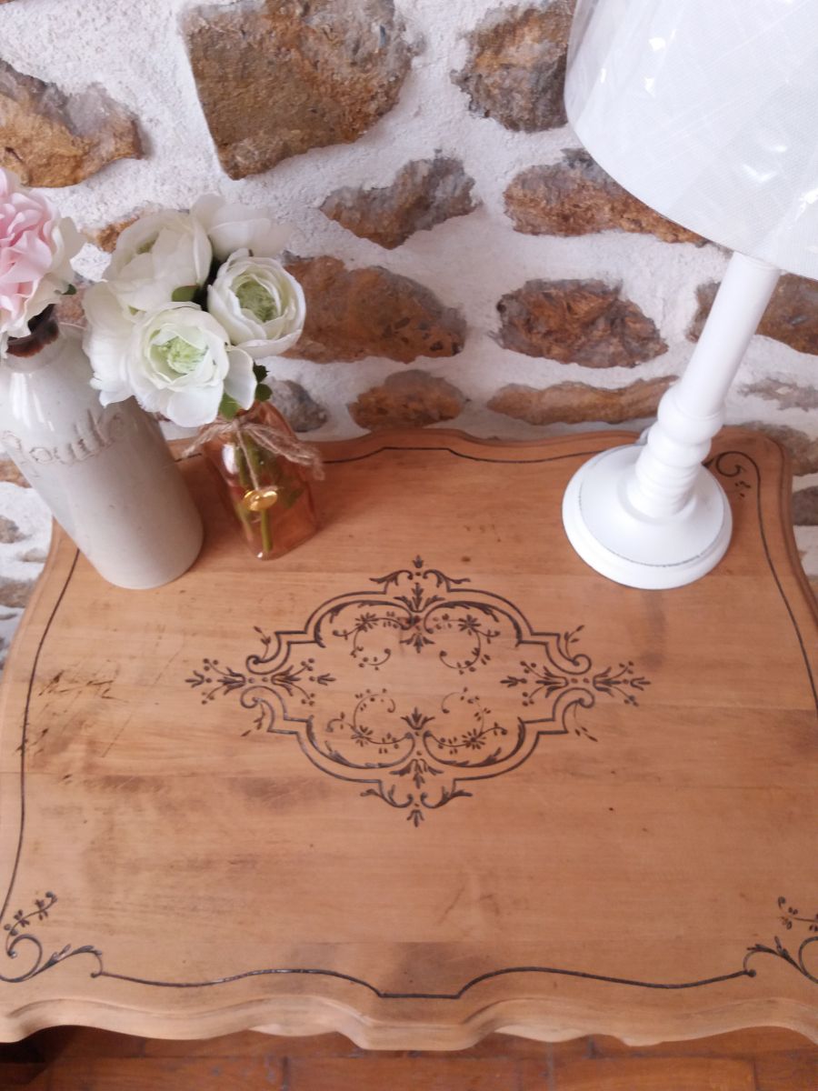 Elle a entièrement été poncée ce qui n'a pas suffit à enlever toutes les traces du temps mais cela ne lui donne t'il pas son charme ?