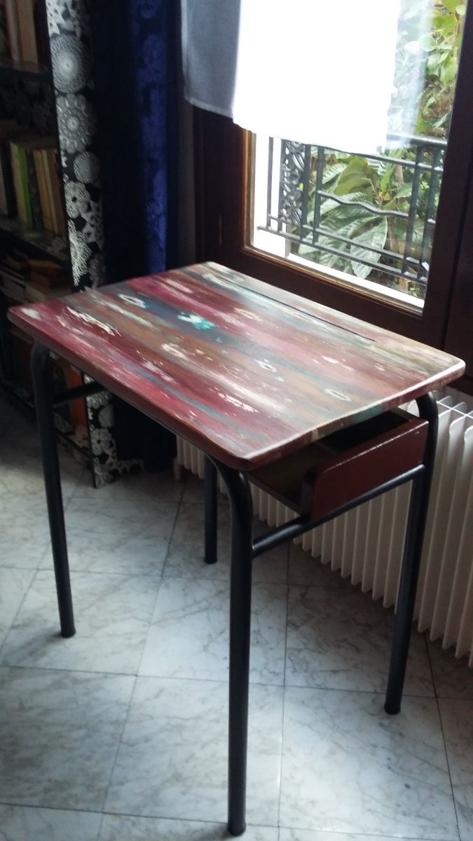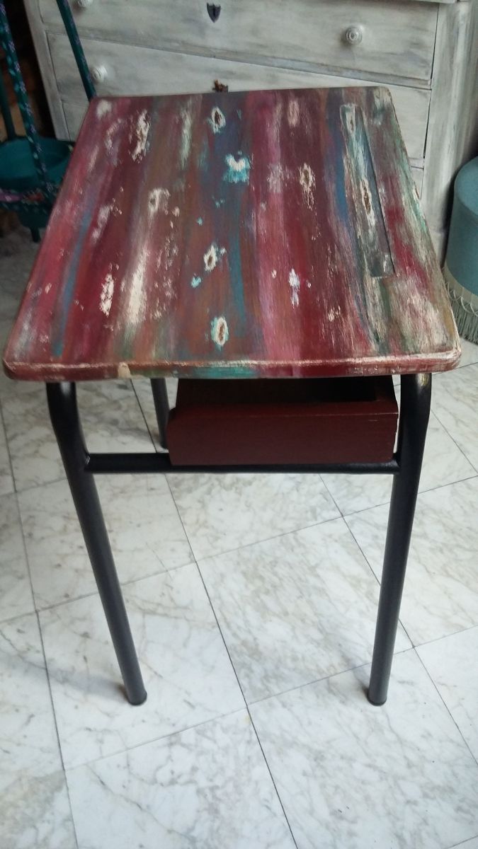 Bureau d'écolier bois 1960 complètement rénové .Prêt à être détruit ,il est devenu pour moi "L'épargné de la mer . Après sa remise en forme il a été traité puis imprégné de couleurs (aubergine ,bleu ,rose ,blanc )pour ensuite l'user. Il donne l'illusion d'avoir été emporté par la mer et d'être revenu vers nous . L'imagination c'est merveilleux!!!