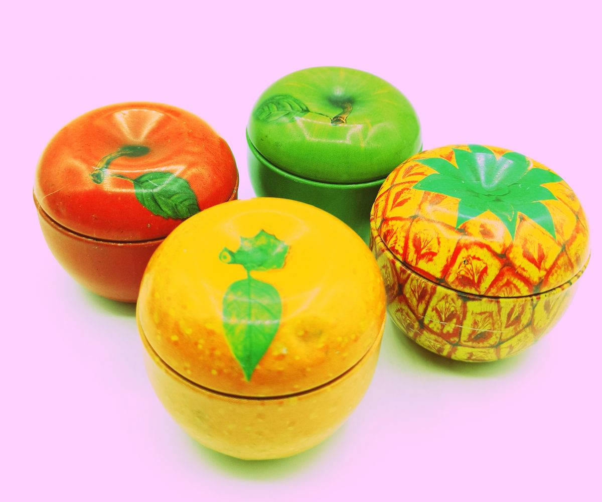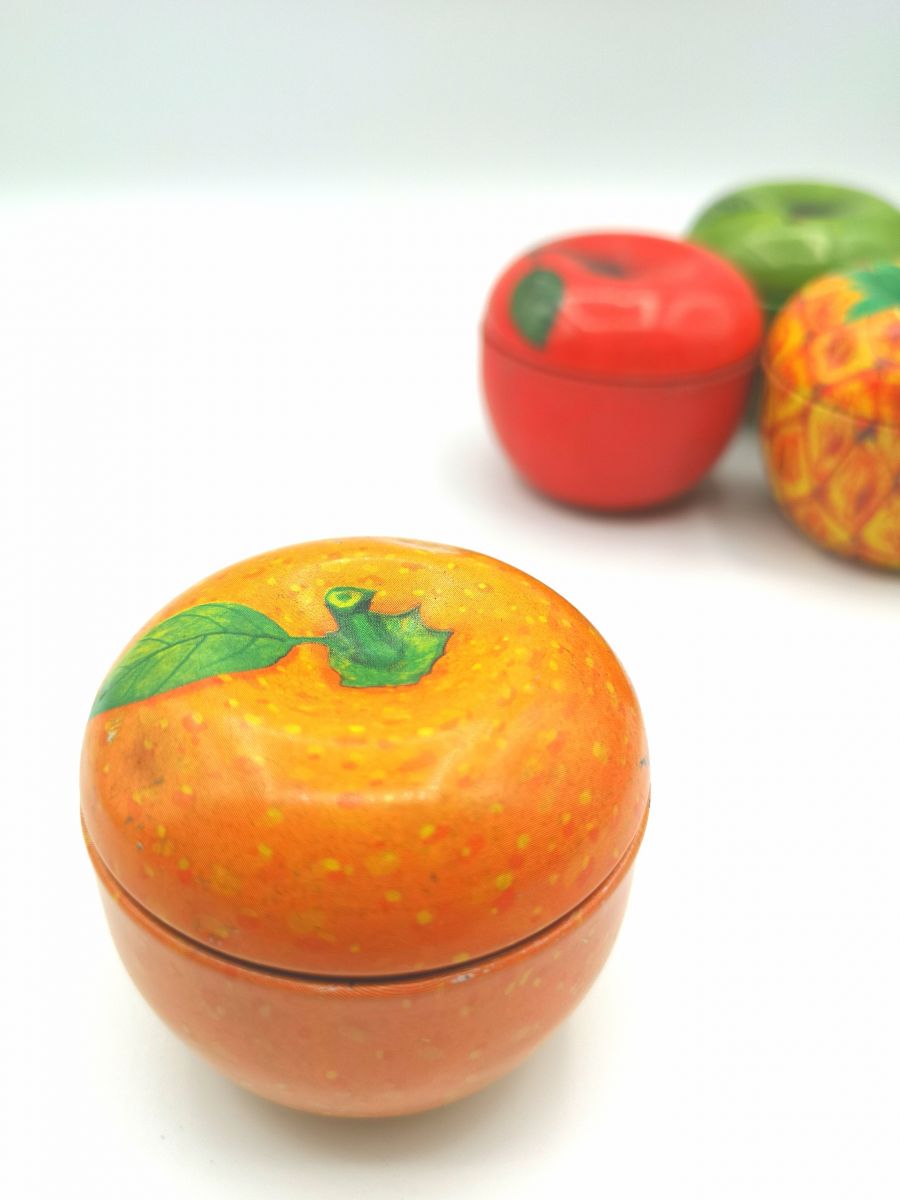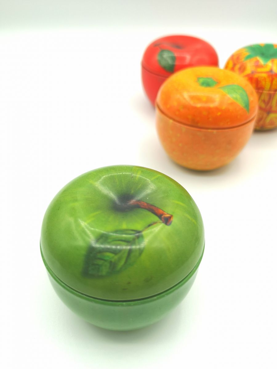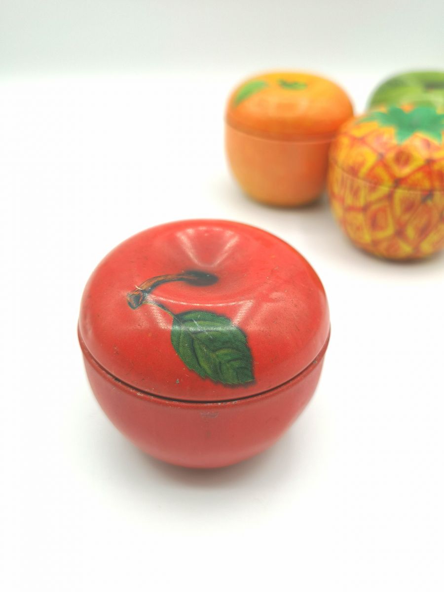 Lot de quatre petites boites en métal en forme de fruits : une pomme rouge, une pomme verte, un ananas, une orange.