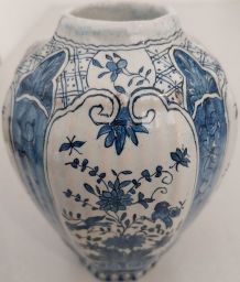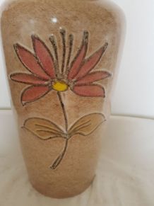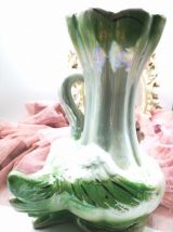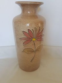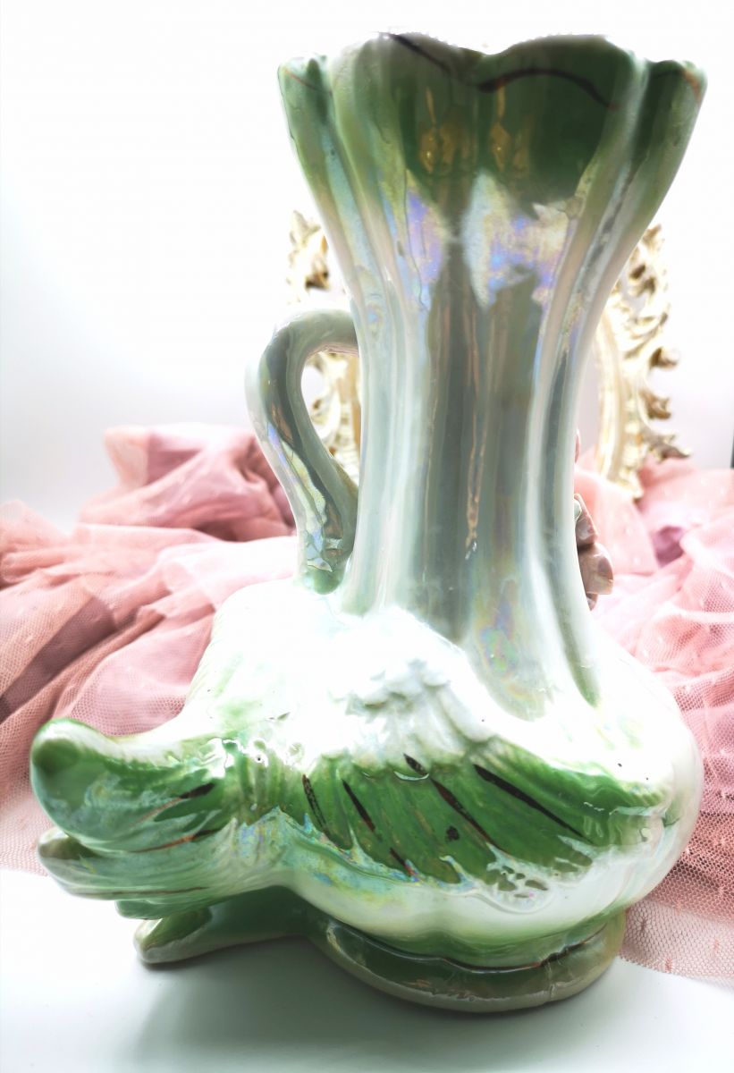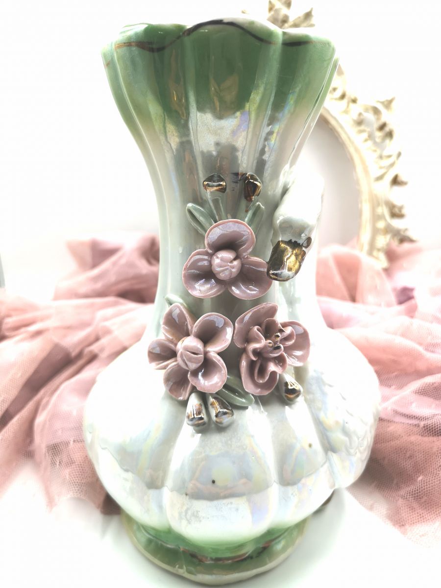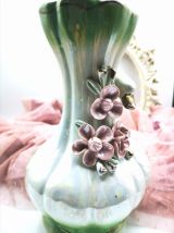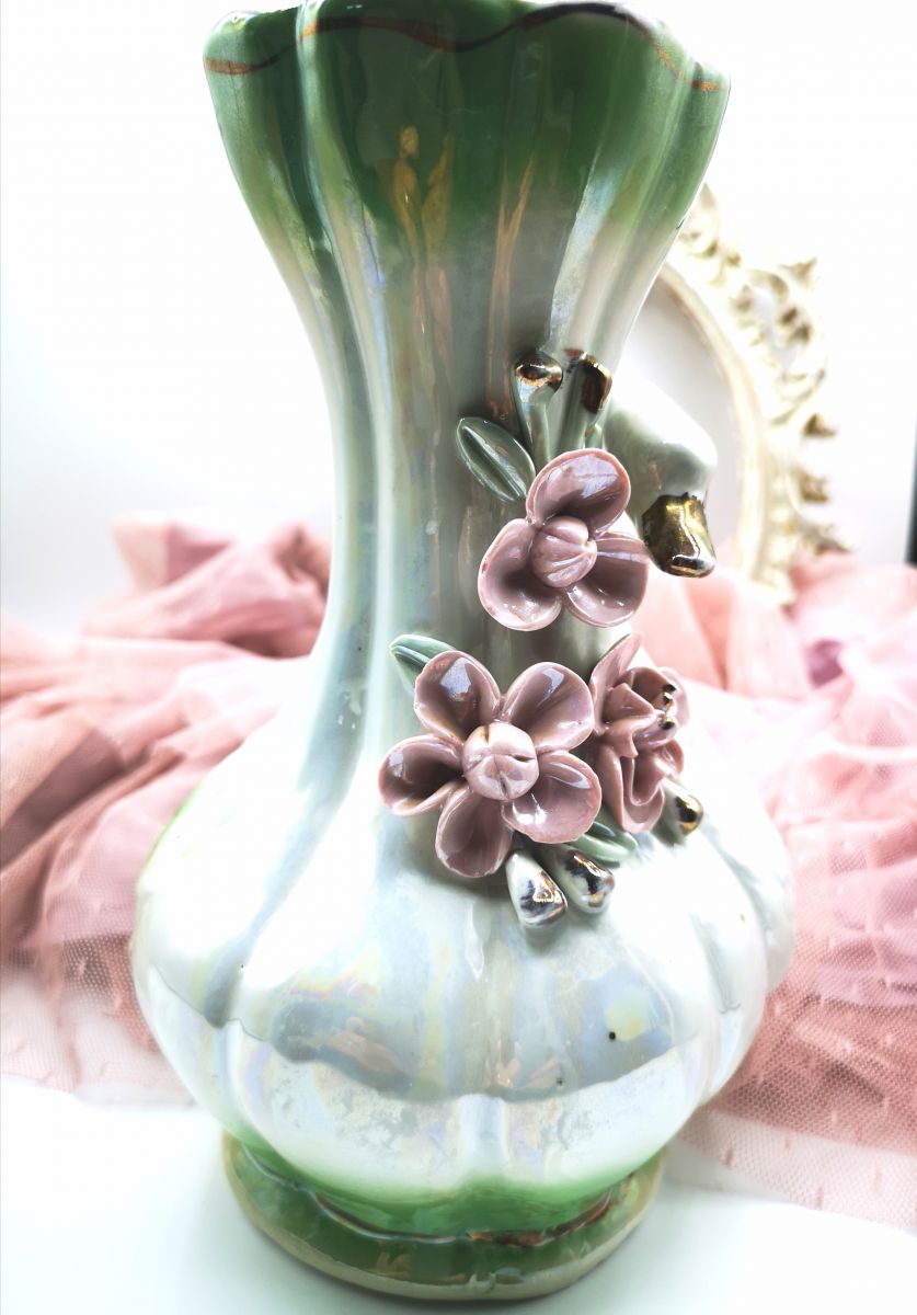 Vase en céramique, blanc et vert nacrés et fleurs en relief rose. Origine et provenance inconnues, fabrication estimée aux années 70 mais peut être plus ancien. Traces d'usure mais en bon état général. Pas de fêlure ni ébréchure.