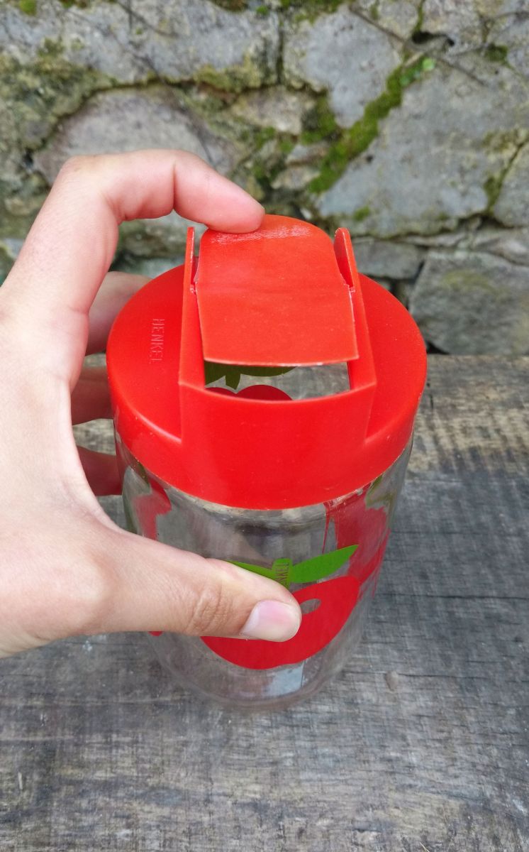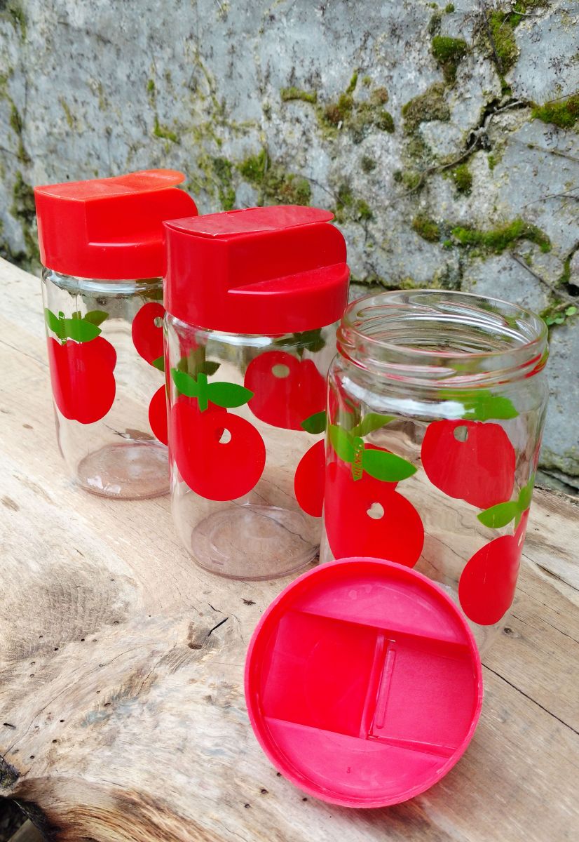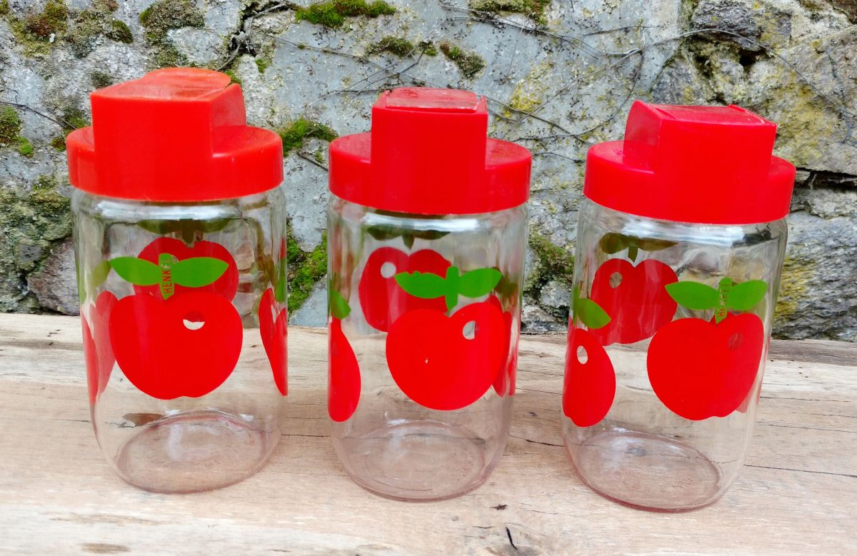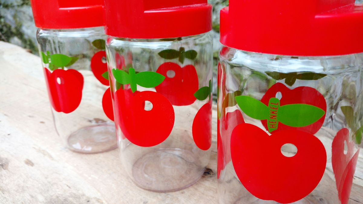Lot de 3 pots Henkel en verre avec ses motifs pomme rouge.