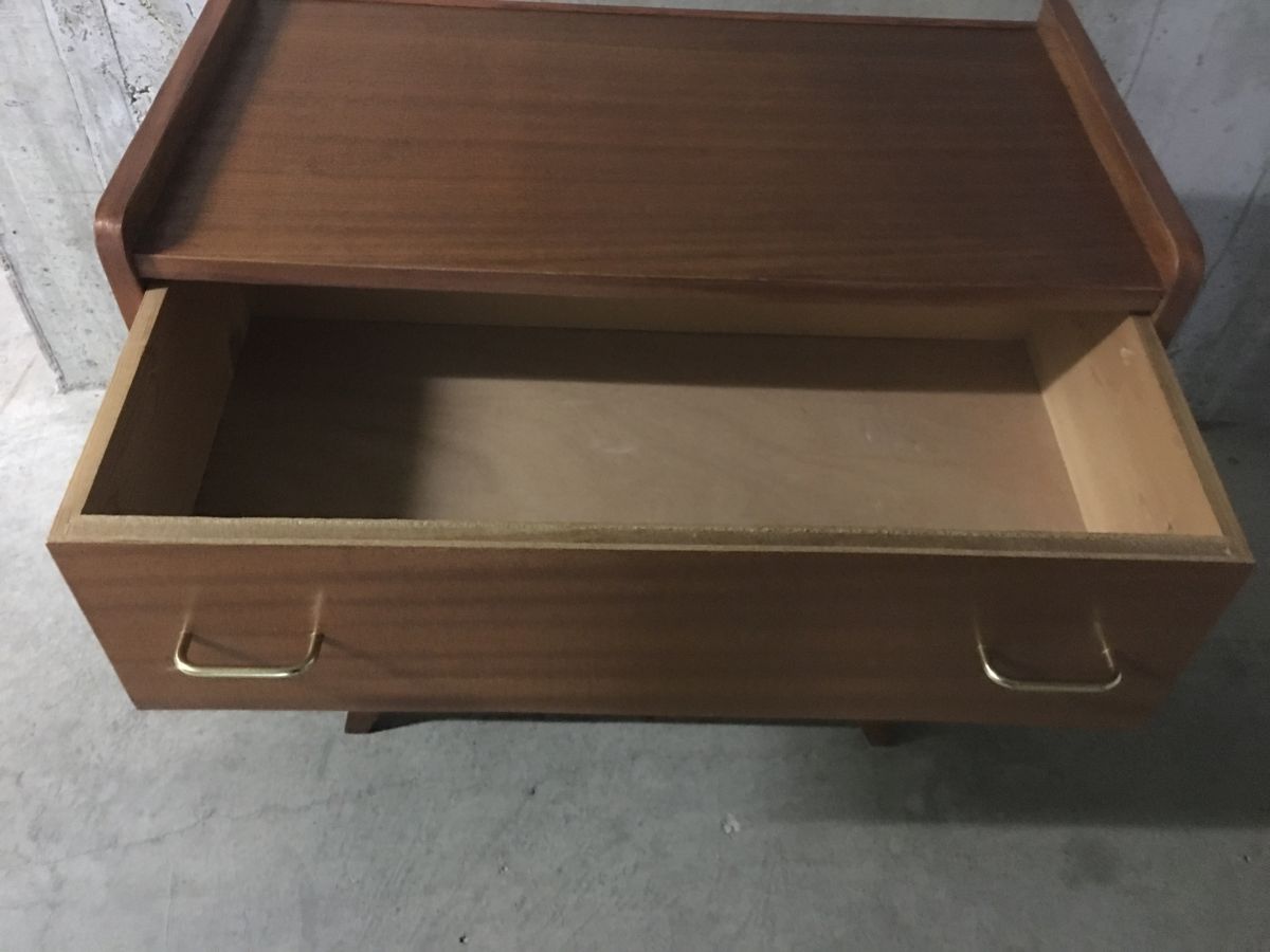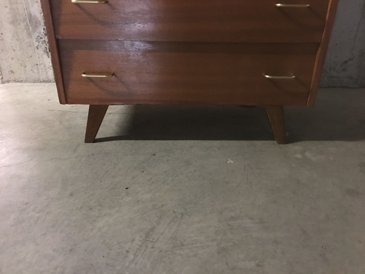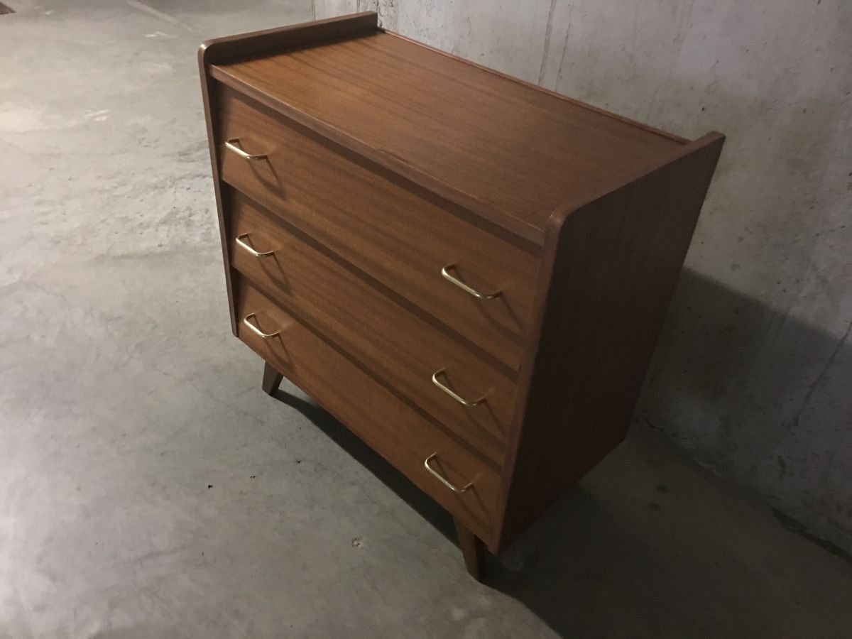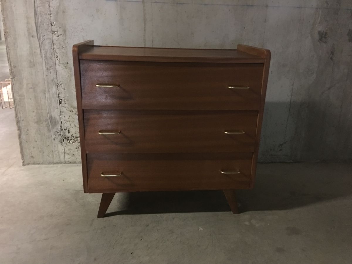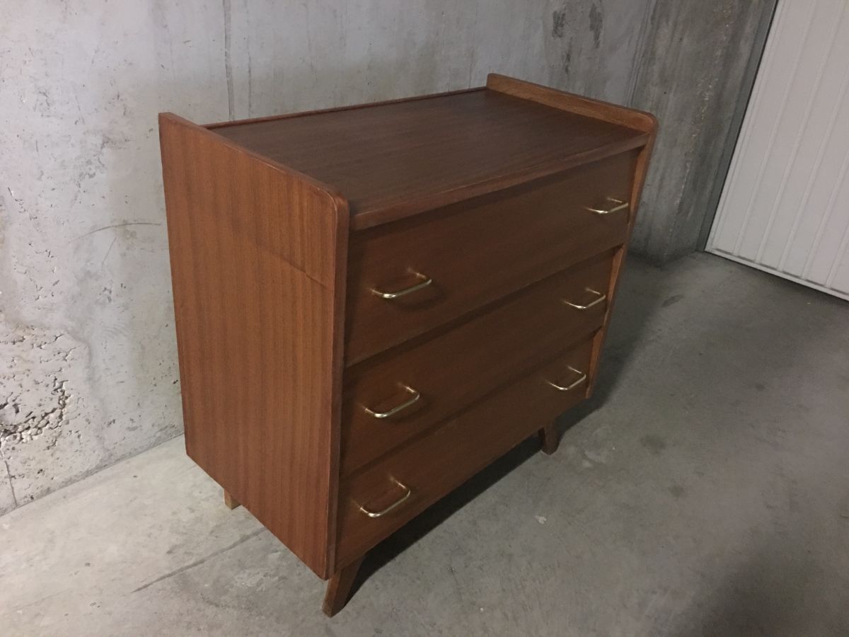 Très jolie petite commode des années 60 en bois et placage, pieds compas, 3 tiroirs biseautés (71x34cm), quelques petits éclats ayant été renforcés à la pâte à bois et revernis sur la tranche arrière absolument sans conséquence ni sur l’esthétique, ni sur la solidité, dimensions (cm) : L.78xH.79xP.40, bon état.