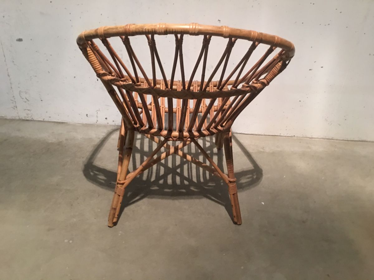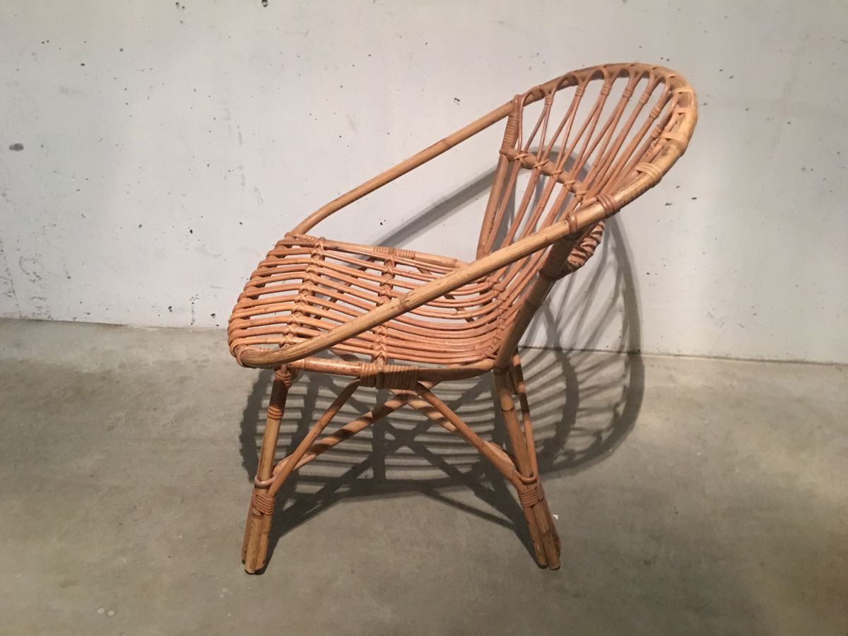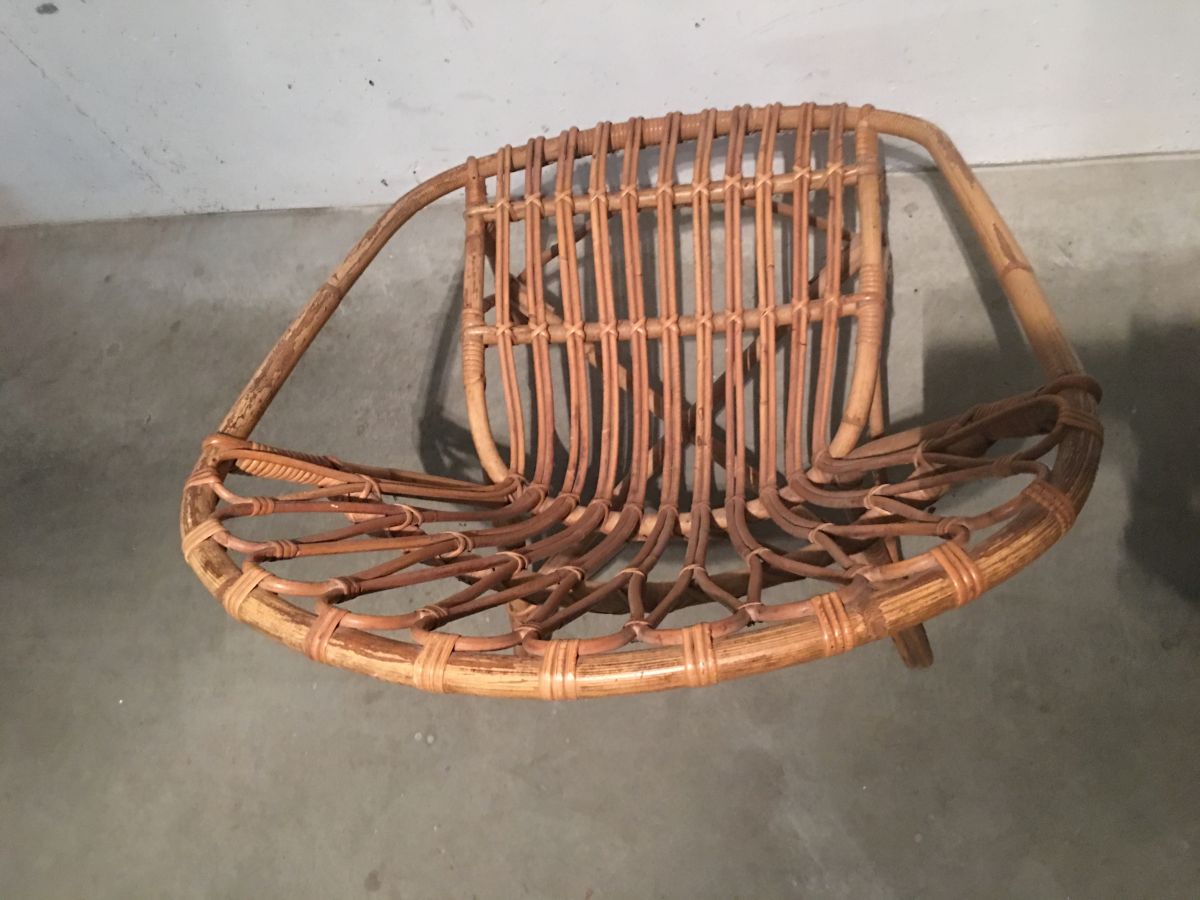 Fauteuil corbeille en rotin des années 60, superbe patine du temps, aucun manque, très stable et solide, hauteur 79cm, hauteur assise 40cm, assise 44x44cm, bon état.