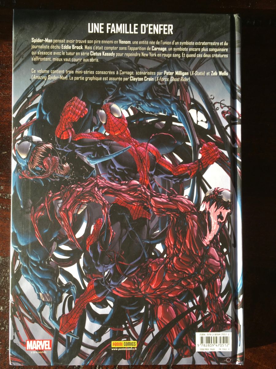 Spider-Man pensait avoir trouvé son pire ennemi en Venom, une entité née de l'union d'un symbiote extraterrestre et du journaliste déchu Eddie Brock. Mais c'était compter sans l'apparition de Carnage, un symbiote encore plus sanguinaire qui s'associe avec le tueur en série Cletus Kasady pour repeindre New York en rouge sang. Et quand ces deux créatures s'affrontent, mieux vaut courir aux abris. Ce volume contient trois mini-séries consacrées à Carnage, scénarisées par Peter Milligan (X-Statix) et Zeb Wells (Amazing Spider-Man). La partie graphique est assurée par Clayton Crain (X-Force, Ghost Rider).
