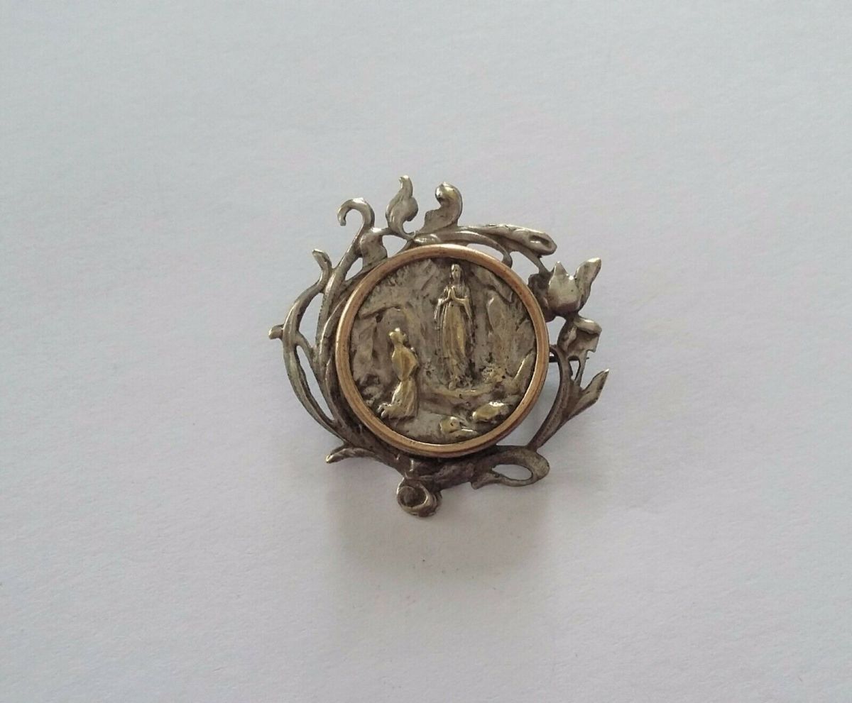 Old Brooch Ancienne Broche Grotte de Lourdes décor Floral en Métal