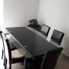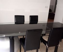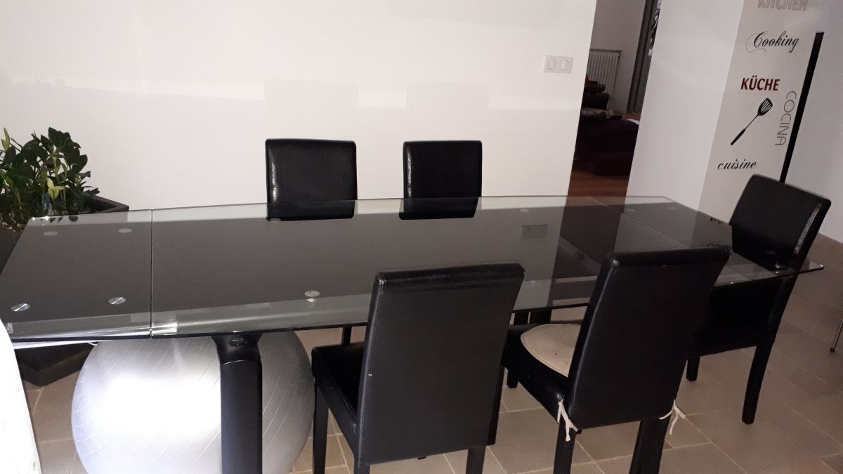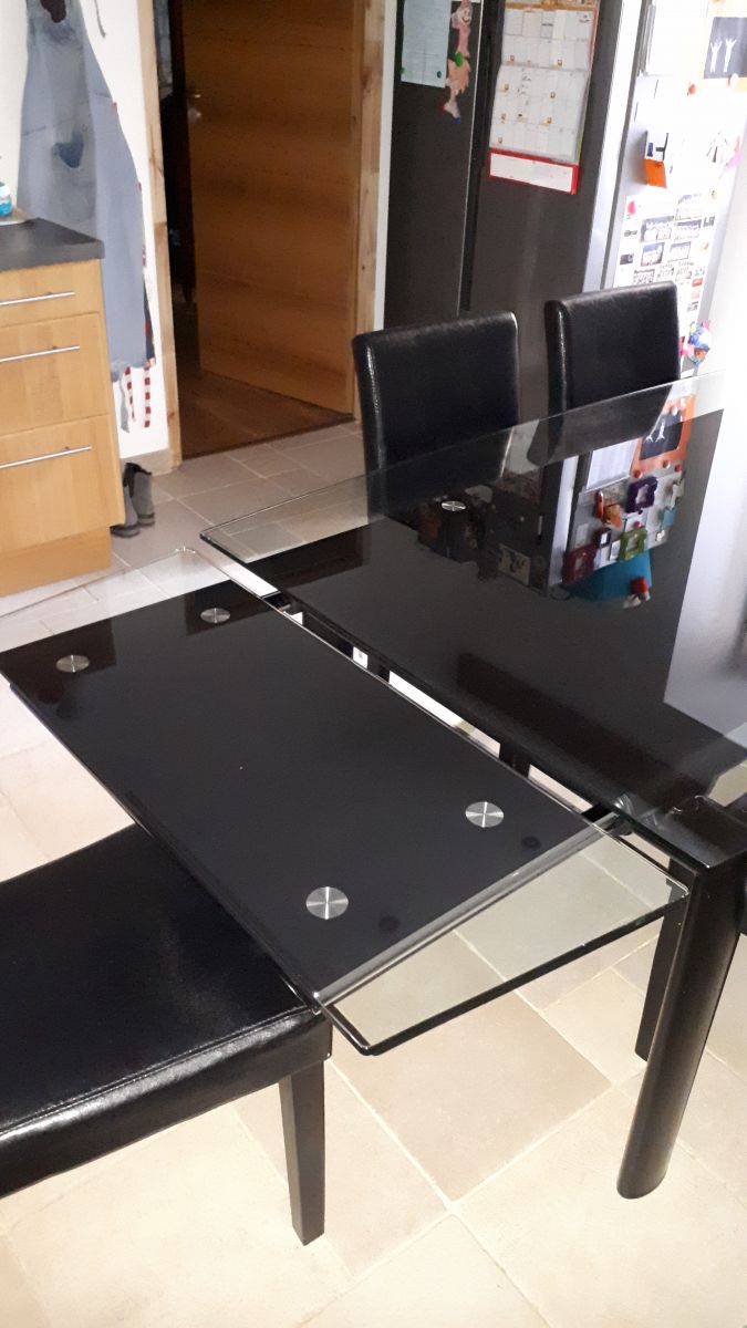 Vends Table en verre de bonne qualité (L 170 cm x l 90 cm x H 75 cm) avec rallonges intégrées (2 x 35 cm) pour une longueur totale de 240 cm. Piètement en métal époxy noir. Bon état.