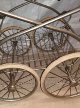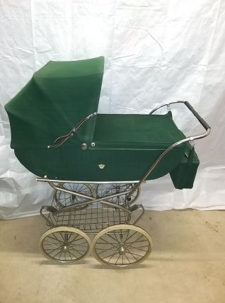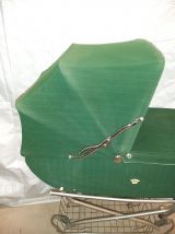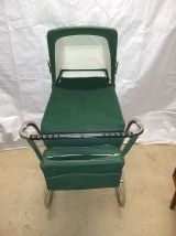 Landau Aubert vintage en tissus vert , velours datant des années 70. En bon état général et tout à fait fonctionnel. Le petit matelas est present ainsi que le transat et ses accessoires d'origines. Quelques petites traces d’oxydation sur le chrome, mais globalement les chromes sont beaux. Les tissus sont en très bon état.une petite reparation au niveau de la capote , voir photos , Un bel objet vintage à utiliser, collectionner ou pour la déco.