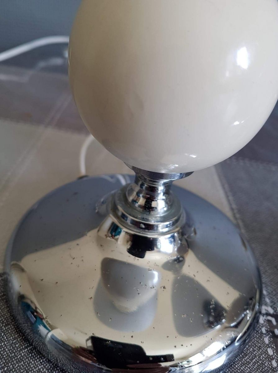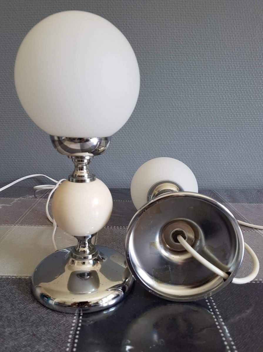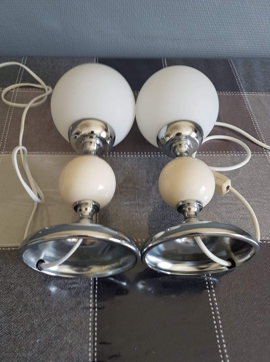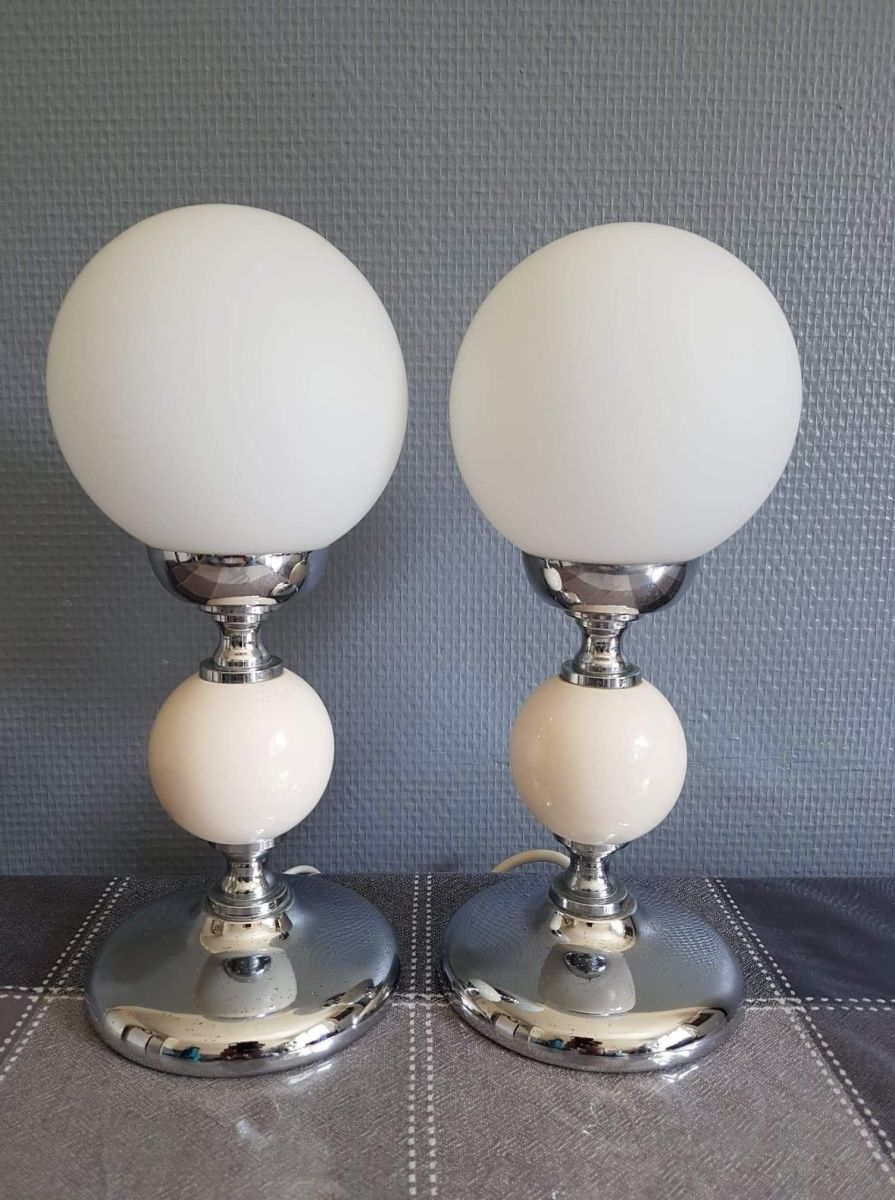 paire de lampes boule opaline blanche mate et bois peint