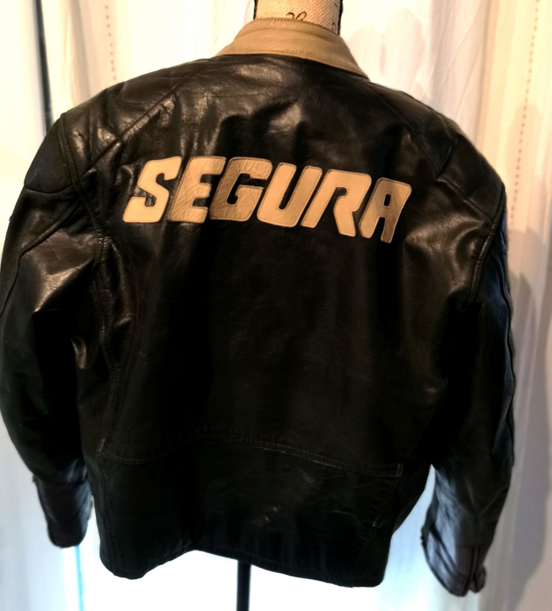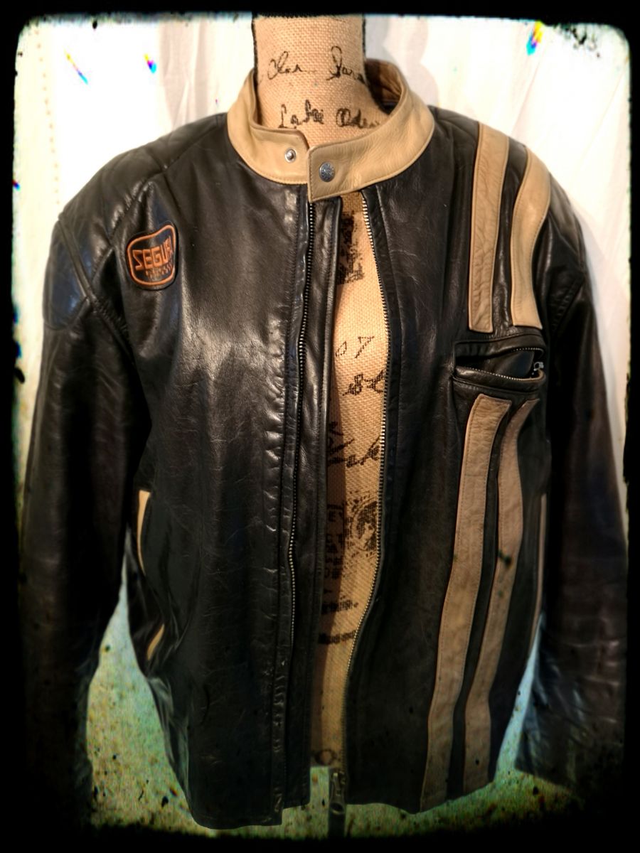 Blouson vintage en cuir SEGURA taille 52, blouson de moto, dans son jus, usé aux manches, col, quelque traces de peinture blanche. Ces défauts lui donne beaucoup de charme avec du vécu.