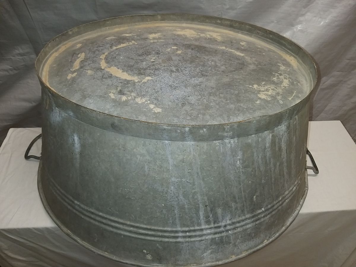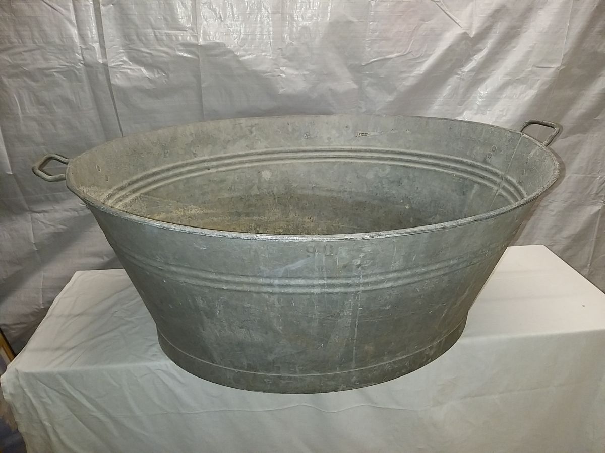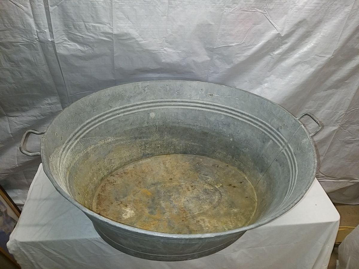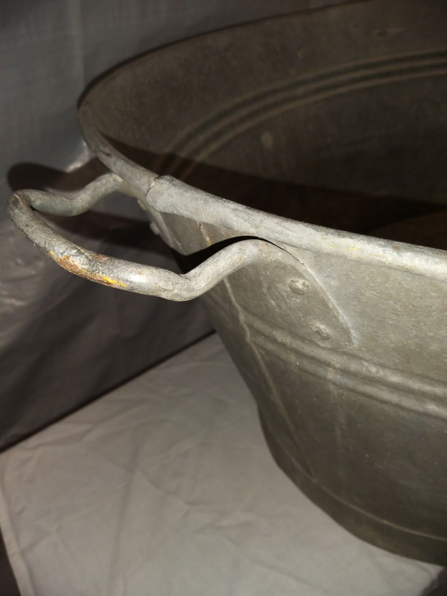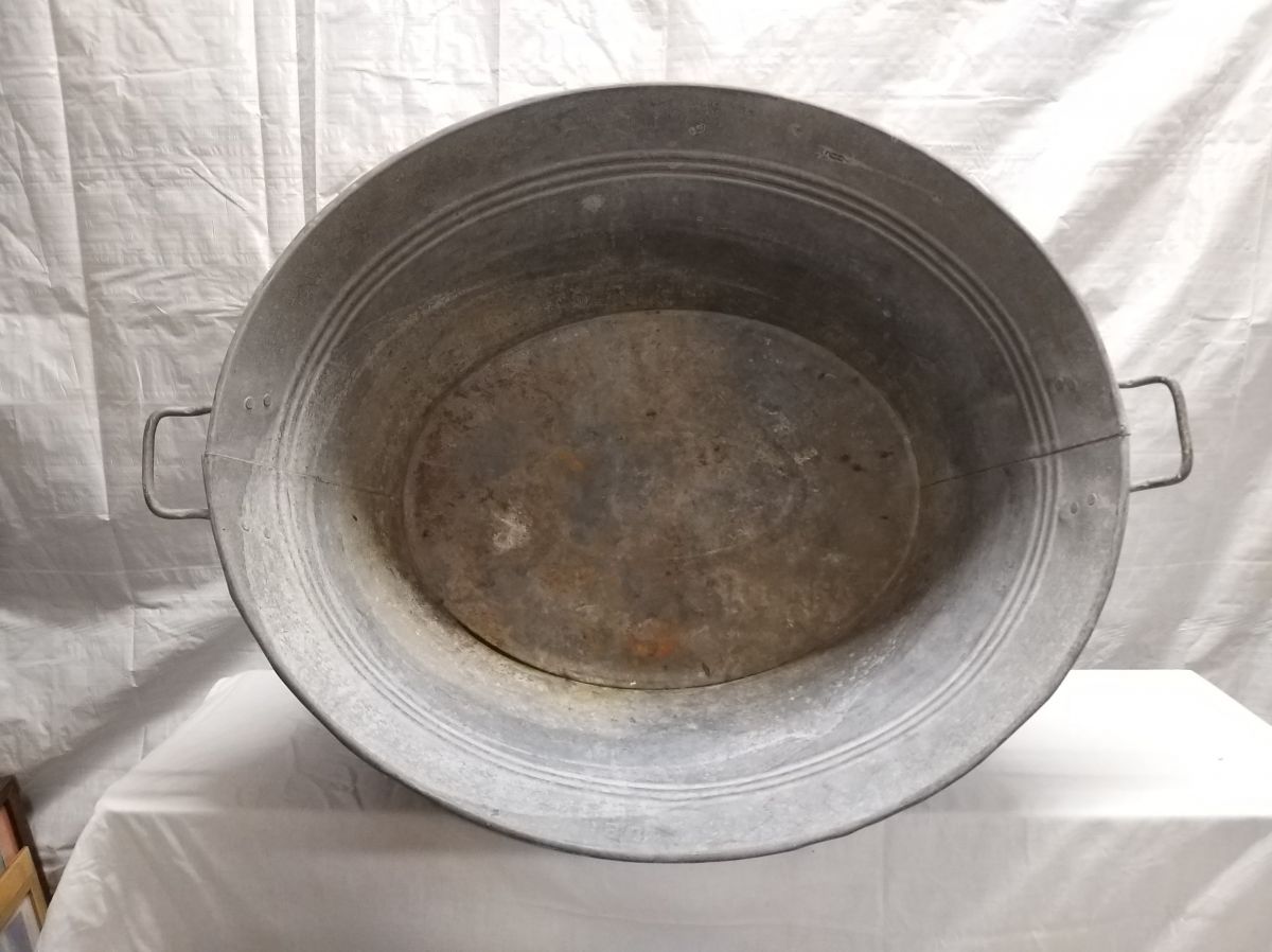 Trés grande bassine en galva / fer , avec ses 2 poignées d'origine , années 70 , bon état , longueur de la bassine de poignée a poignée 100 cm sans poignees , au pied ( bas ) long 69 cm largeur 51 cm....