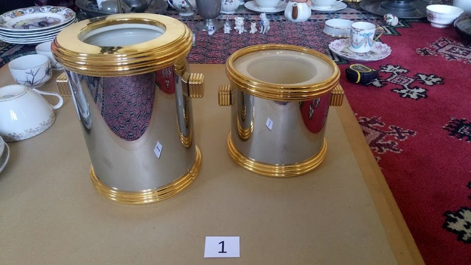 Ensemble de seaux à bouteille et glaçons de chez Lancel. En plastique argent et doré.