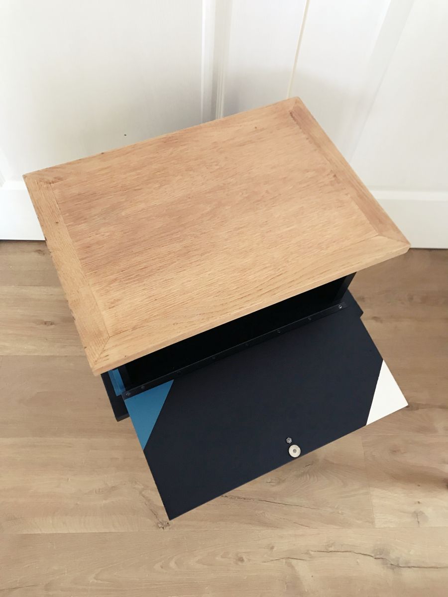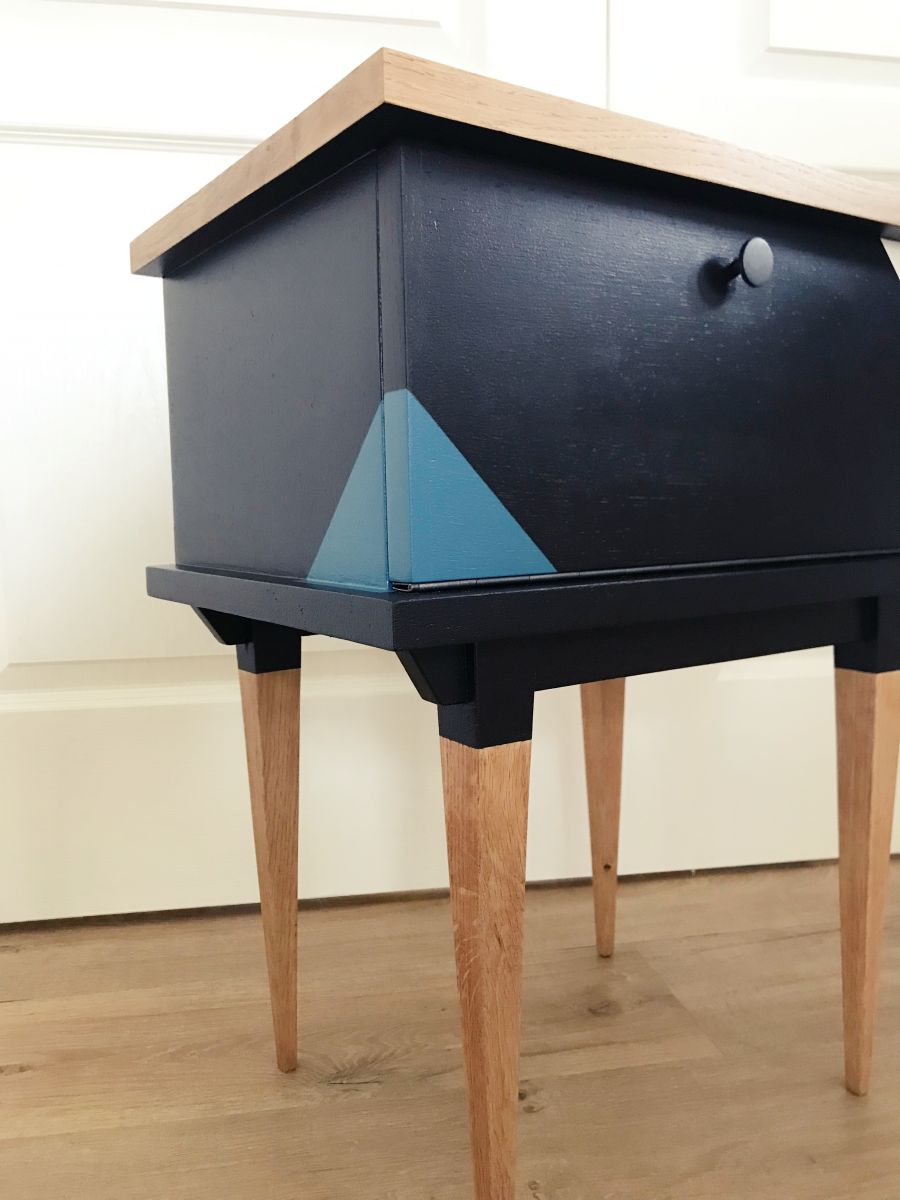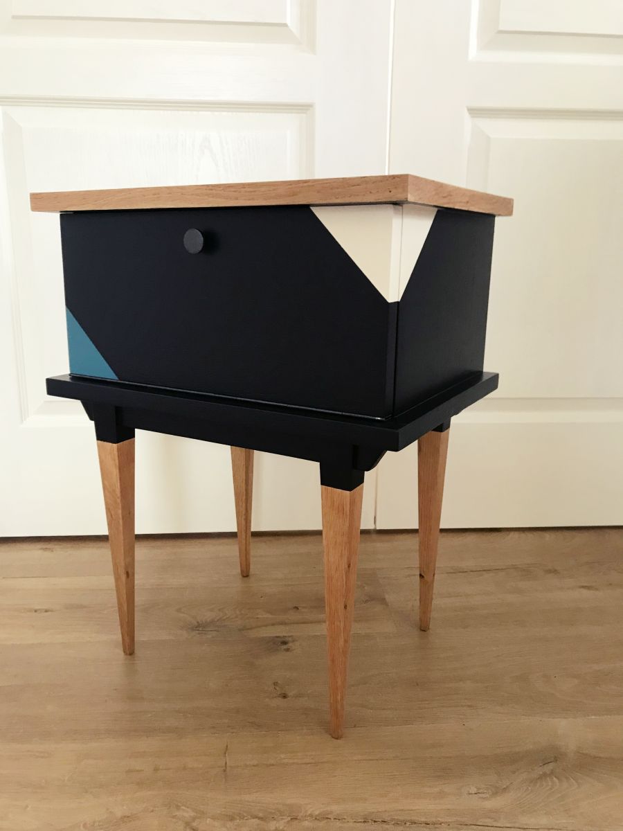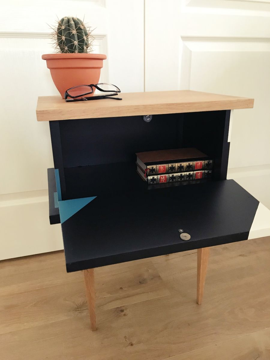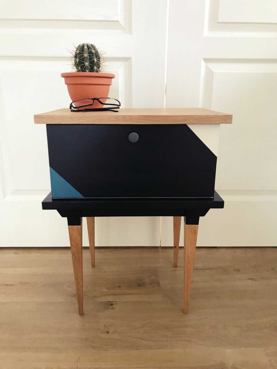chevet années 60 revalorisé pour un look et des détails actuels en bois mat et noir chic…