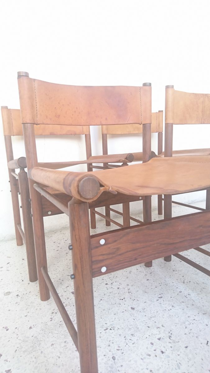 édité par "L'Atelier" au Brésil dans les années 50 En bois de rose, jacaranda du Brésil et cuir. Les structures en bois sont en bon état générales, es cuirs sont relativement tachés.