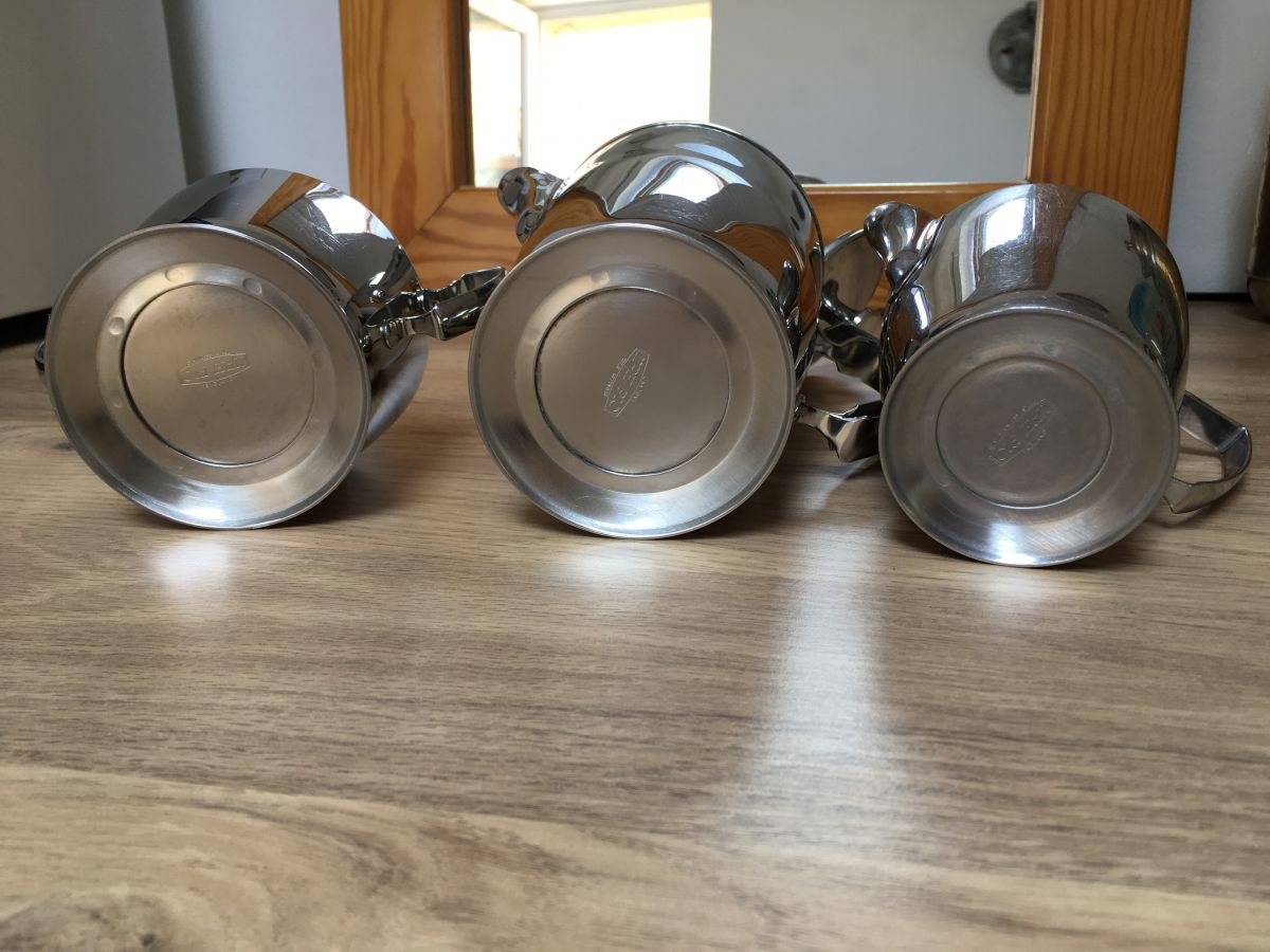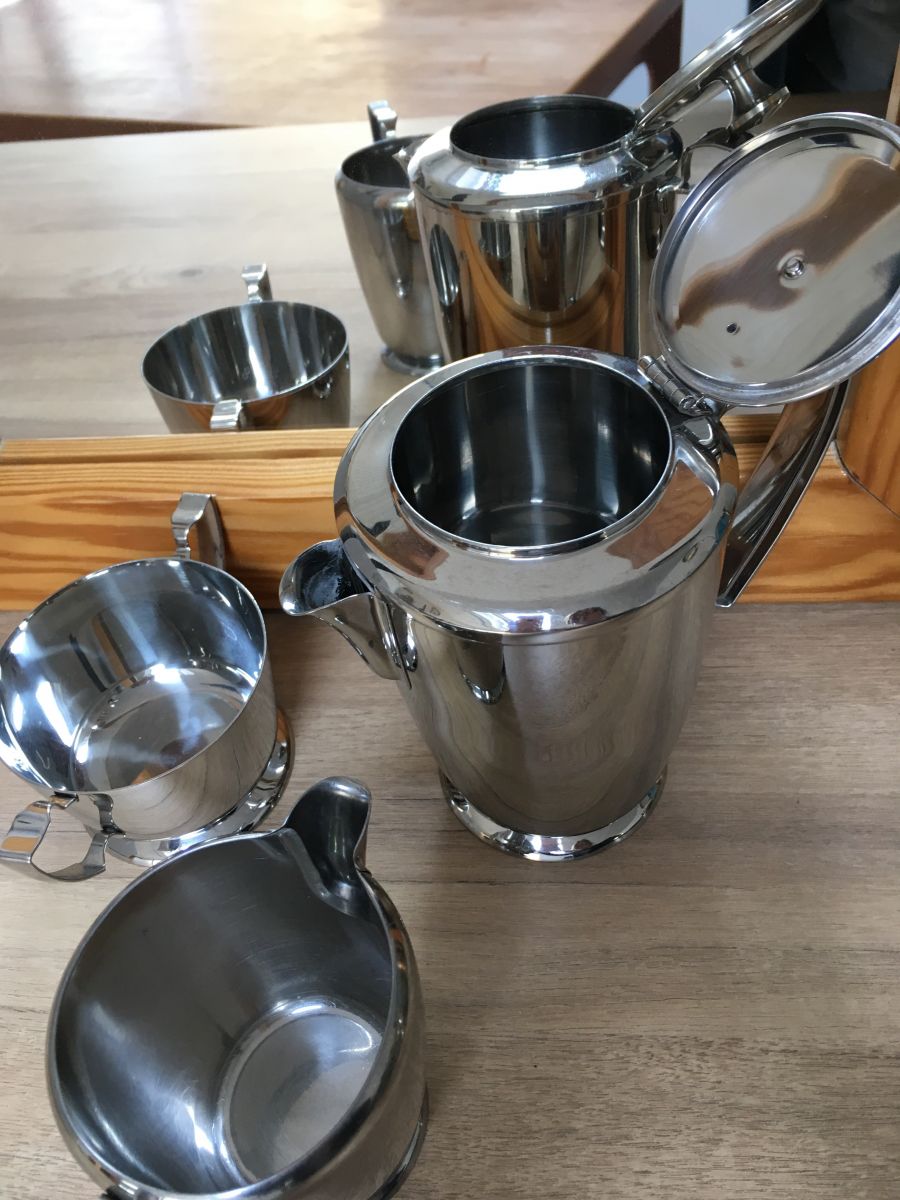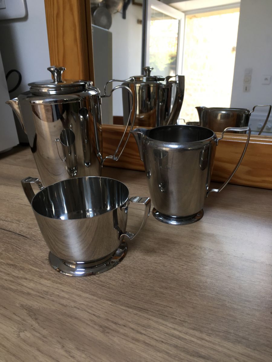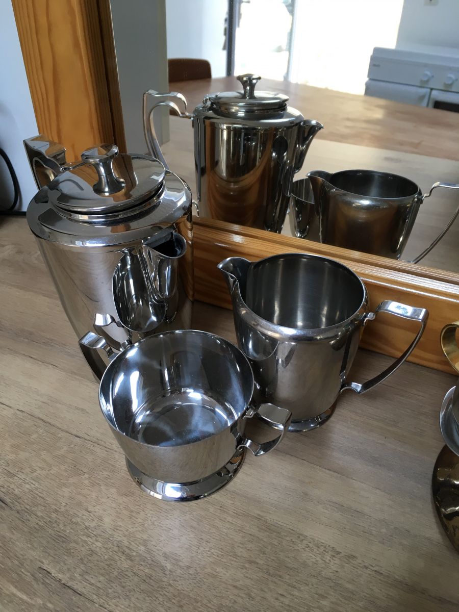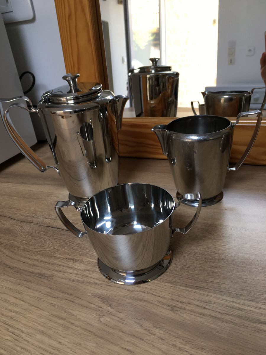 Service 3 pièces inox (STAINLESS STEEL- ENGLAND). Verseuse, Pot à lait, Sucrier.