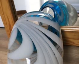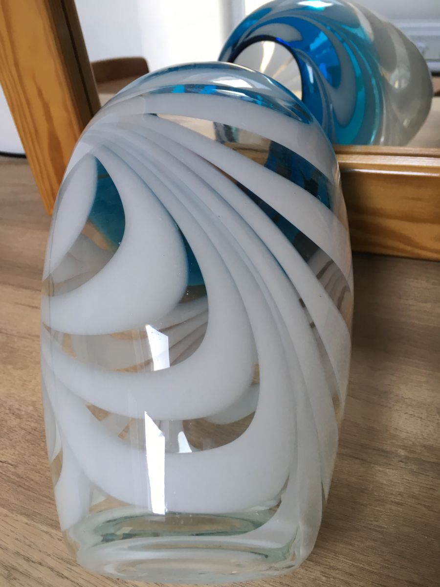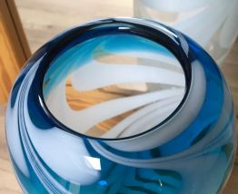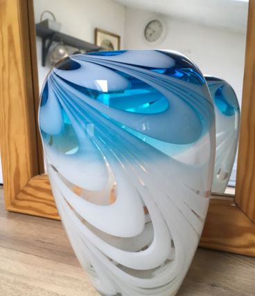Grand vase épais, entrelacés de bleu turquoise, de blanc et transparent. Hauteur 24cm. Très bon état.