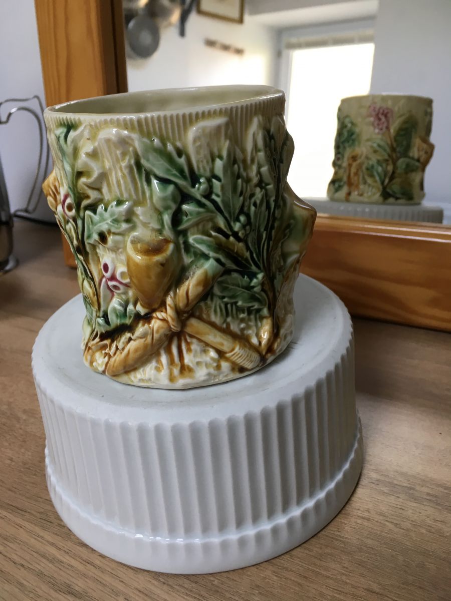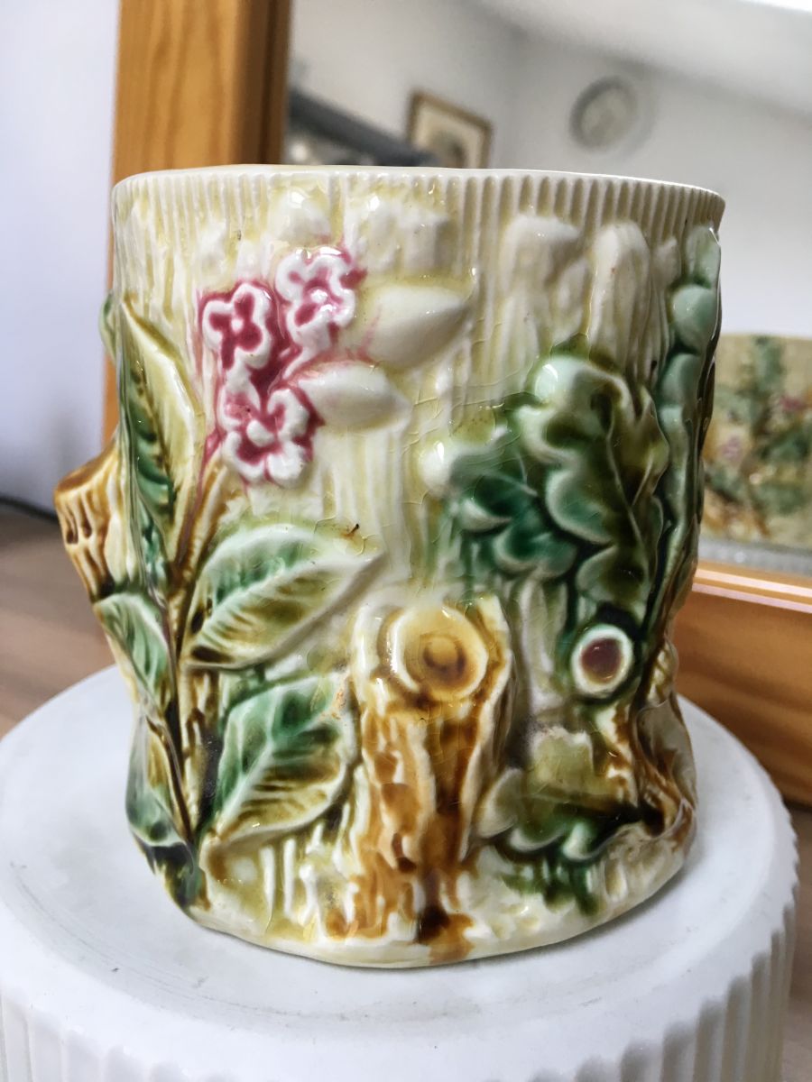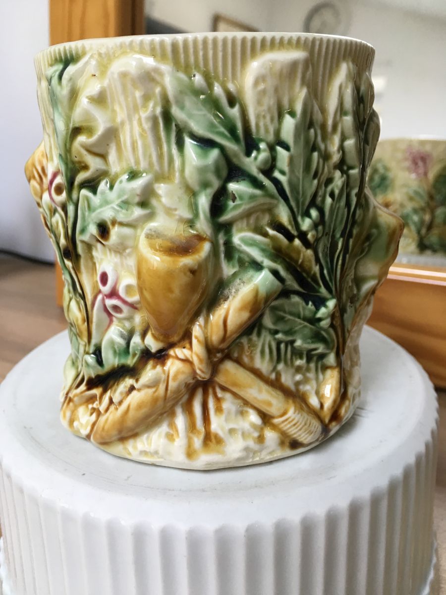 Diamètre 9cm / Hauteur 10cm. Barbotine très bon état. Rameaux de chêne, feuillage fleurs roses, pipe.... Pot en forme de fût d’arbre.