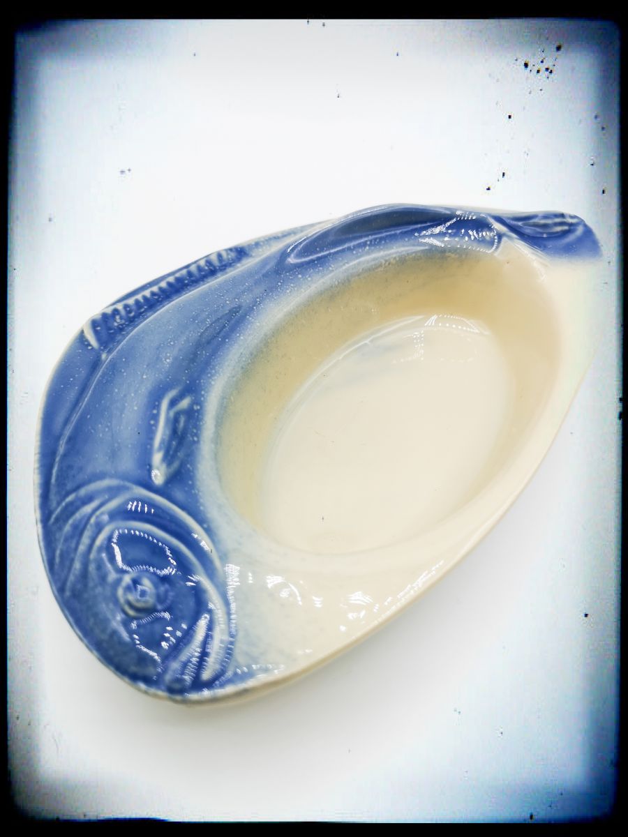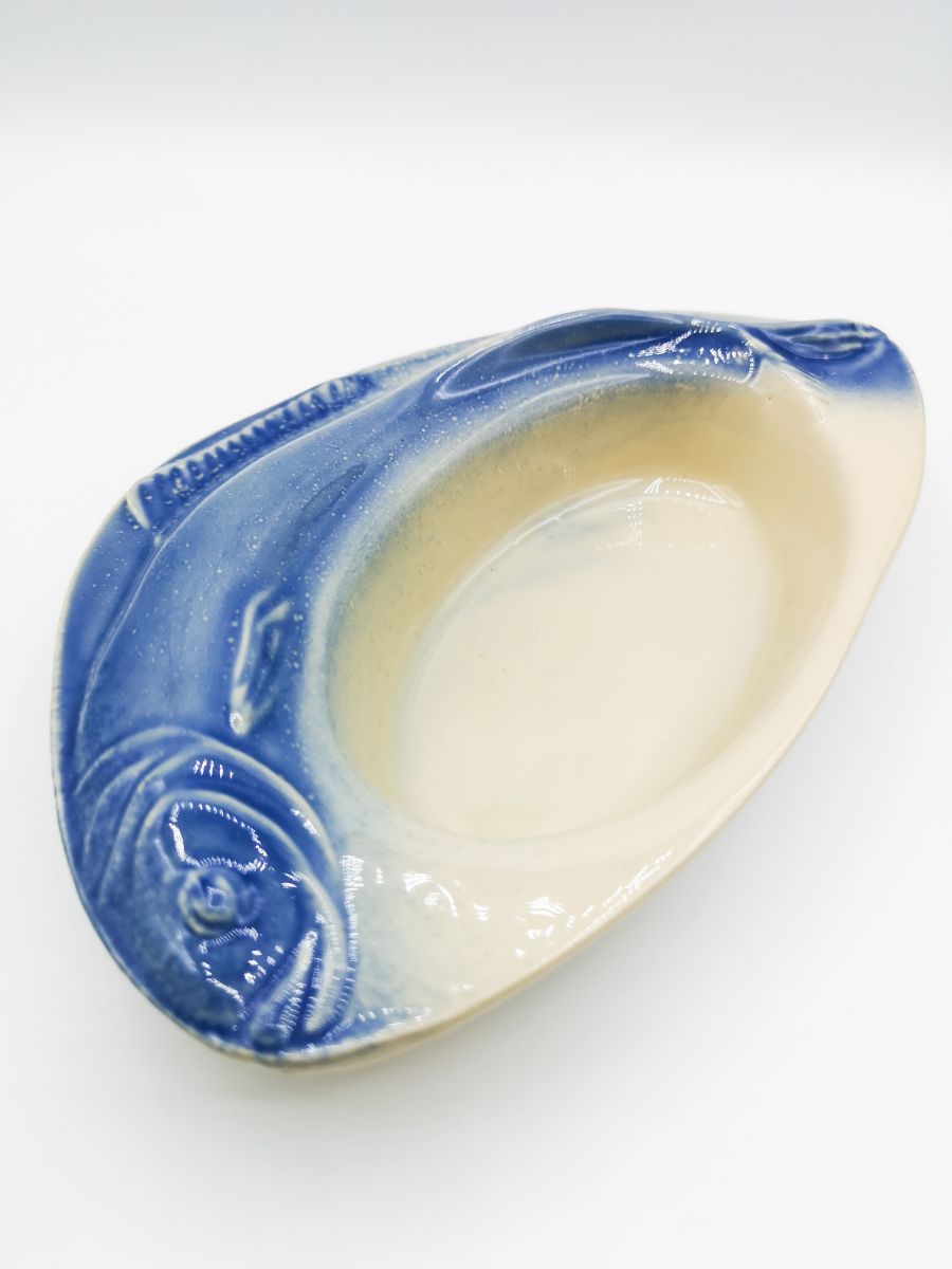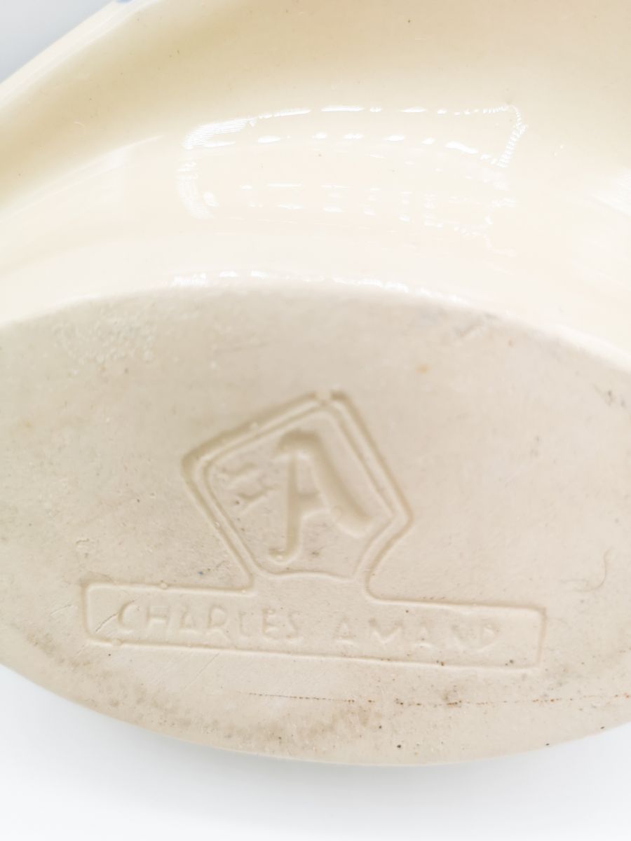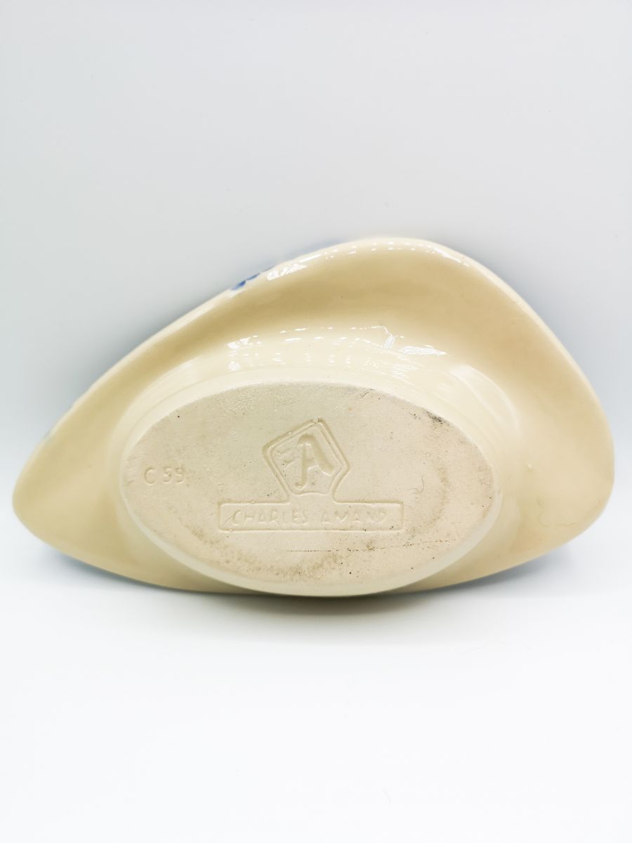 Plat en céramique signé Charles Amand C59 en forme de poisson. En parfait état, pas d'éclats ni fêlures.