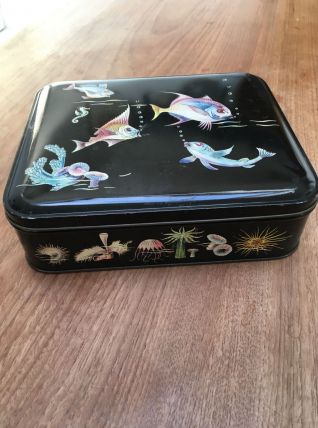 Boîte en fer blanc, dans son « jus », 24cm x20cm. À décor de faune marine: anémones, hippocampe, méduse, coraux, ???? poissons, le tout sur fond noir.