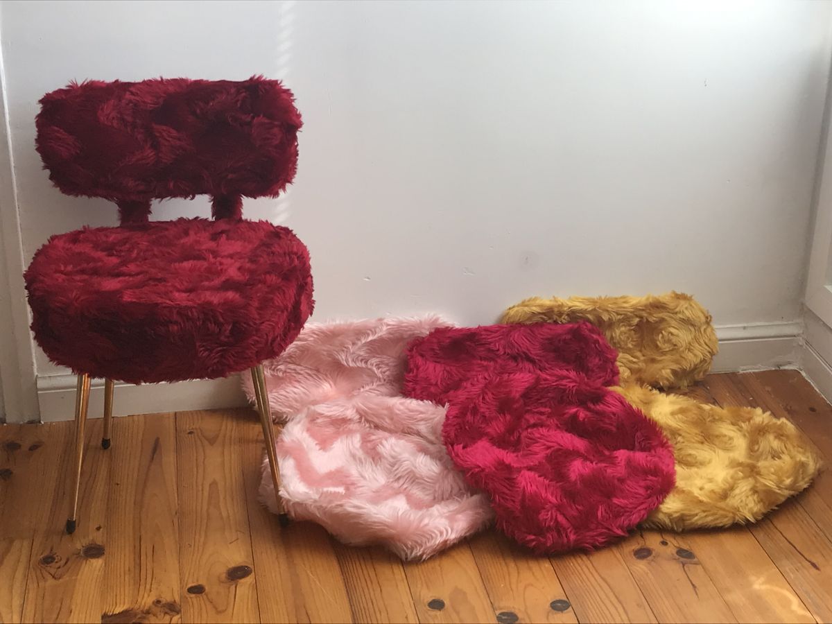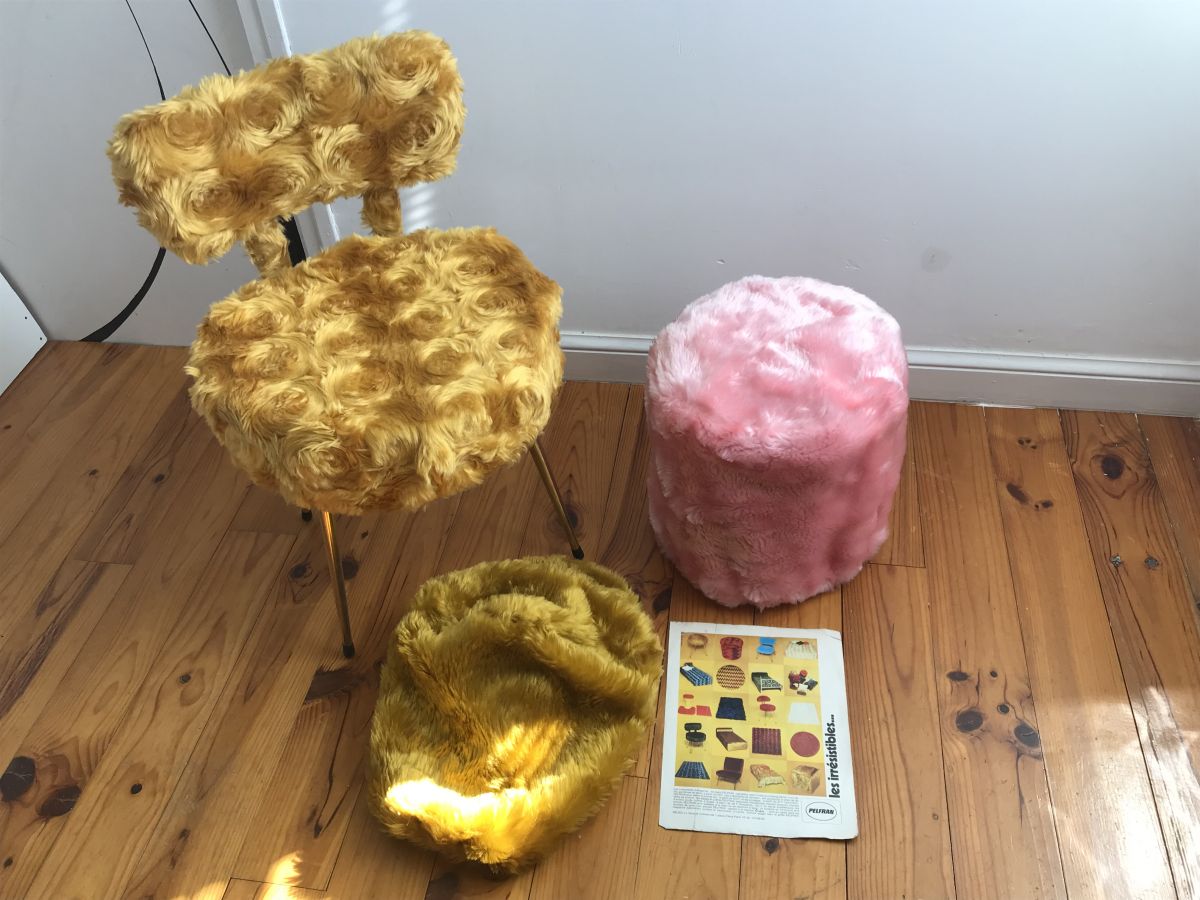 Authentiques Housses moumoute année 1970 de marque PELFRAN pour chaises et poufs. ( neuves )