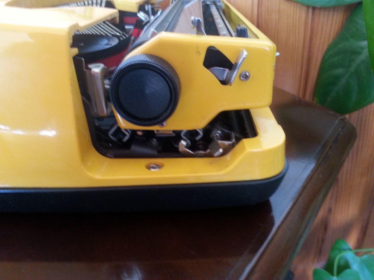 Couleur jaune orangée,marque Brothers Nogamatic 400 années 70 et malgré les années le rouleau encreur fonctionne toujours