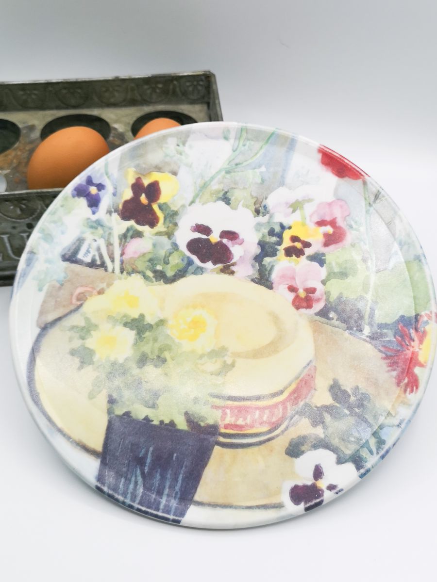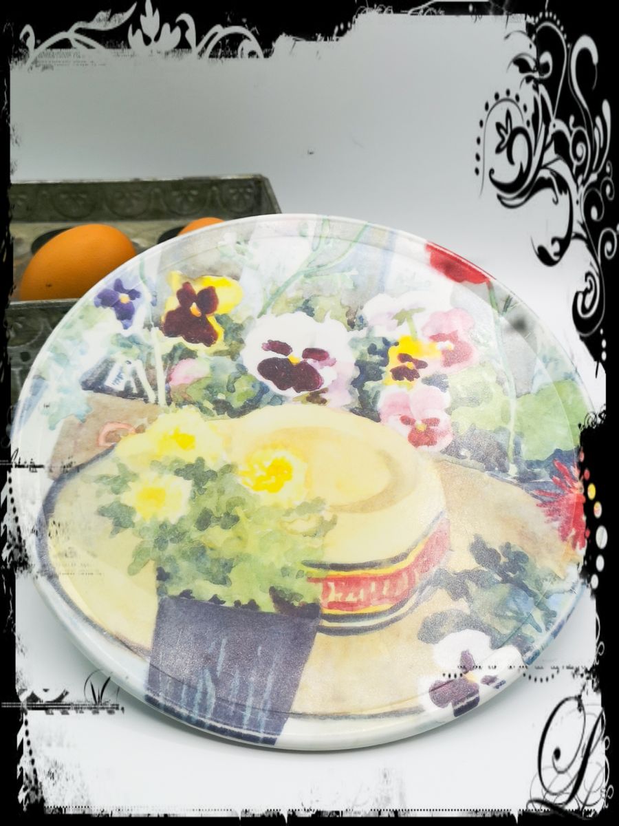 Joli dessous de plat en plastique moulé mélamine, fabriqué en Italie par R2S. Un joli dessin printanier de fleurs avec chapeau canotier évoque un déjeuner à la campagne.