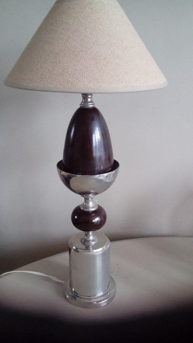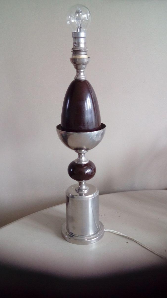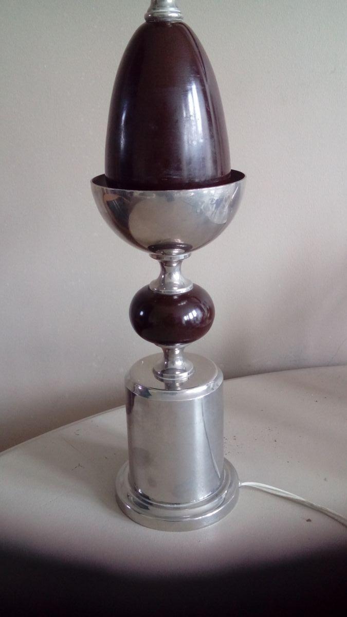 Lampe métallique vintage des années 50 argent et noir. Le pied de la lampe comporte des boules et demi-sphères et l'abat-jour est en piqué de coton. La lampe est en très bon état et fonctionne.