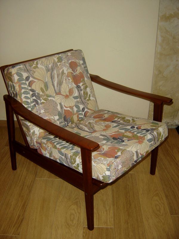Très beau fauteuil scandinave des années 60 en teck .Beau tissu printanier sans tâche ni accroc, déhoussable . Mousses bonnes. Sangles bonnes.Ligne élégante et aérienne .Super design .