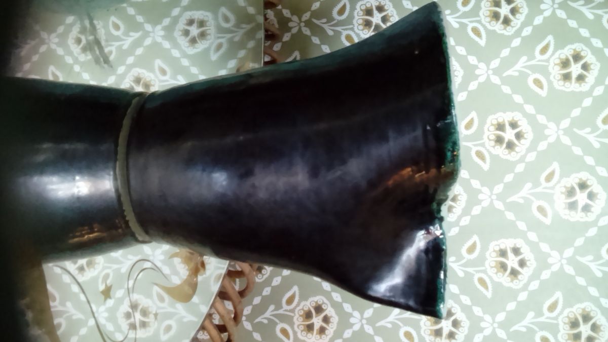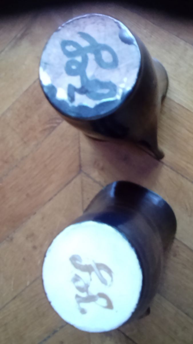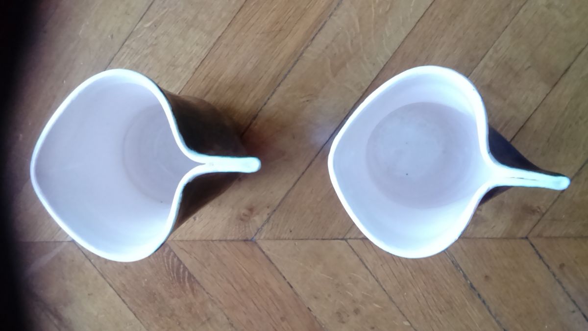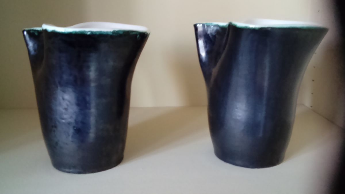 Une paire de très beaux vases vintage signés de forme originale avec une engobe noire irisée et l'intérieur blanc. En très bon état.
