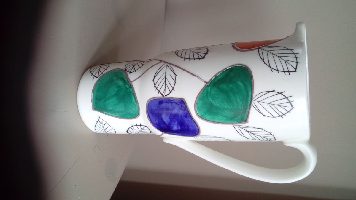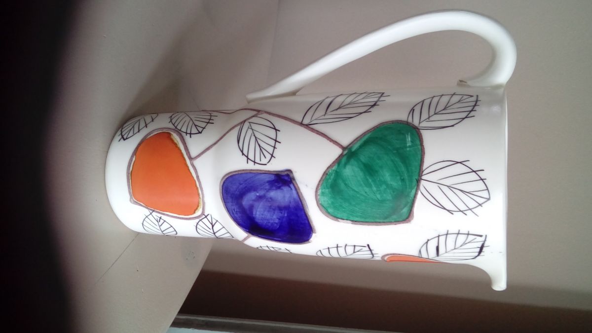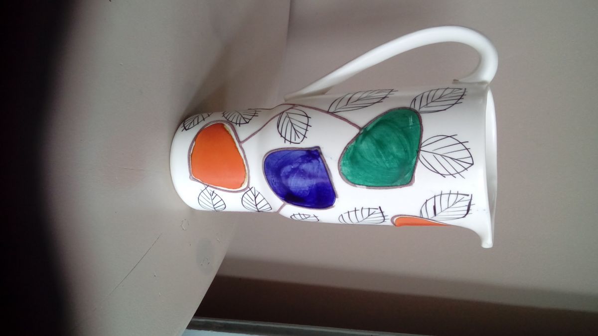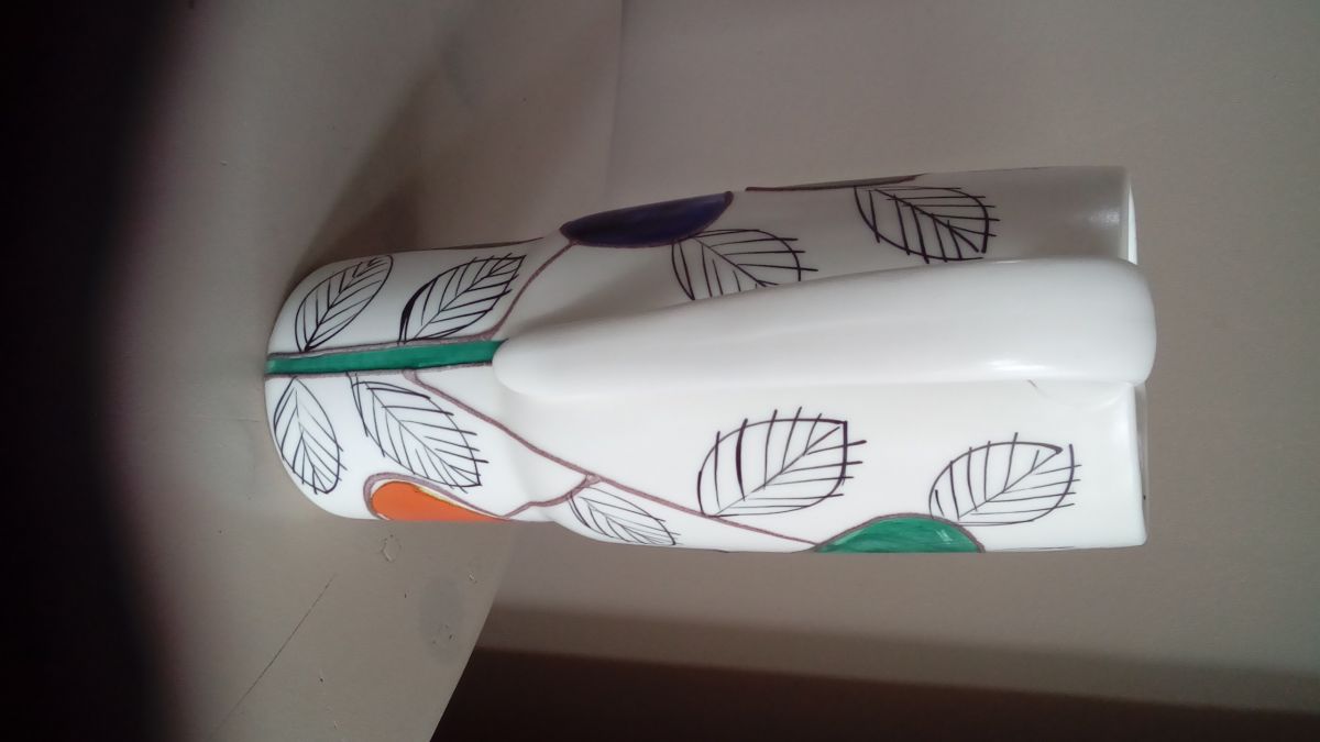 Céramique vintage très originale à motif de feuilles dans un style naif. En bon état , juste un léger éclat au niveau du bec.