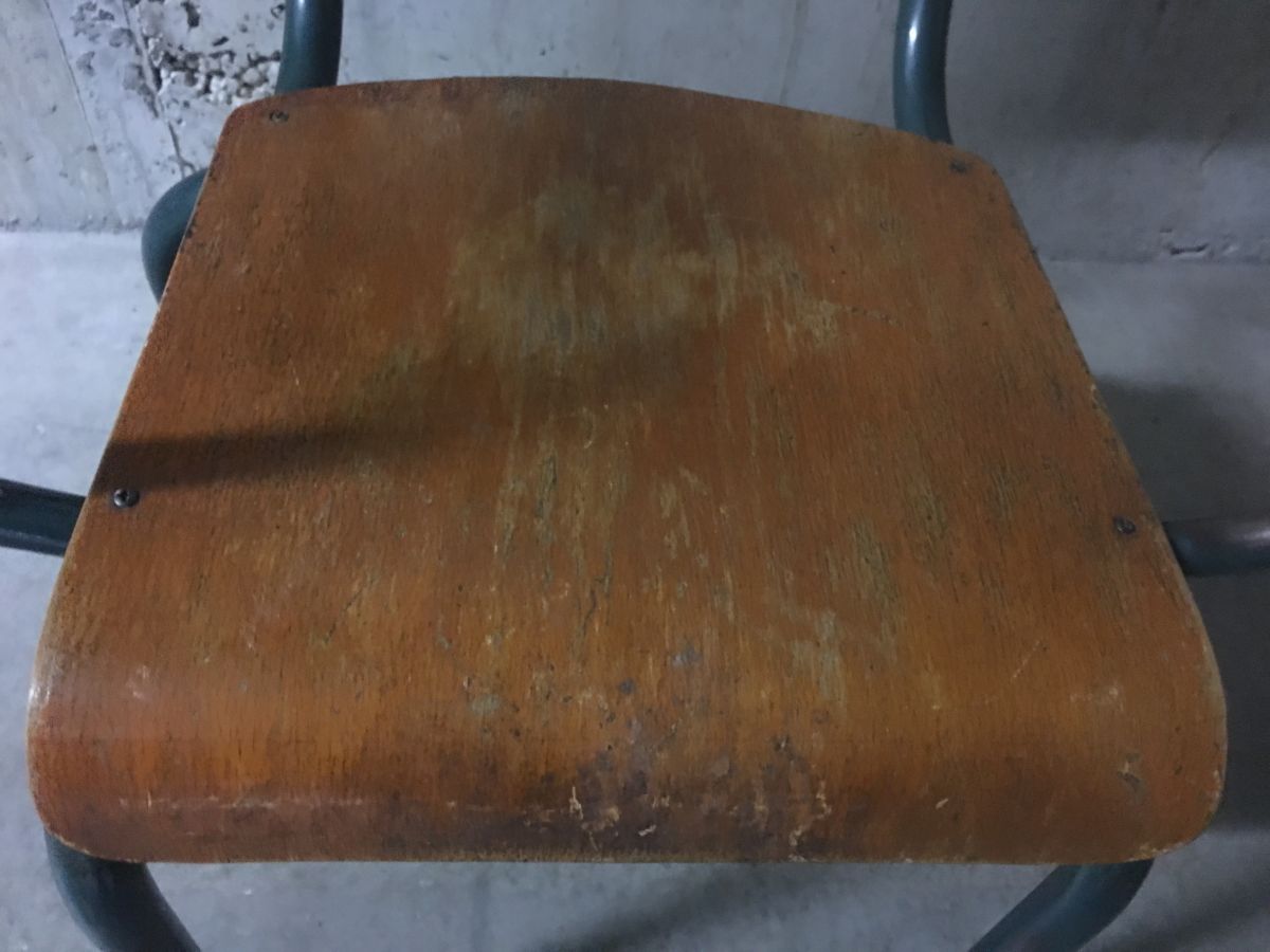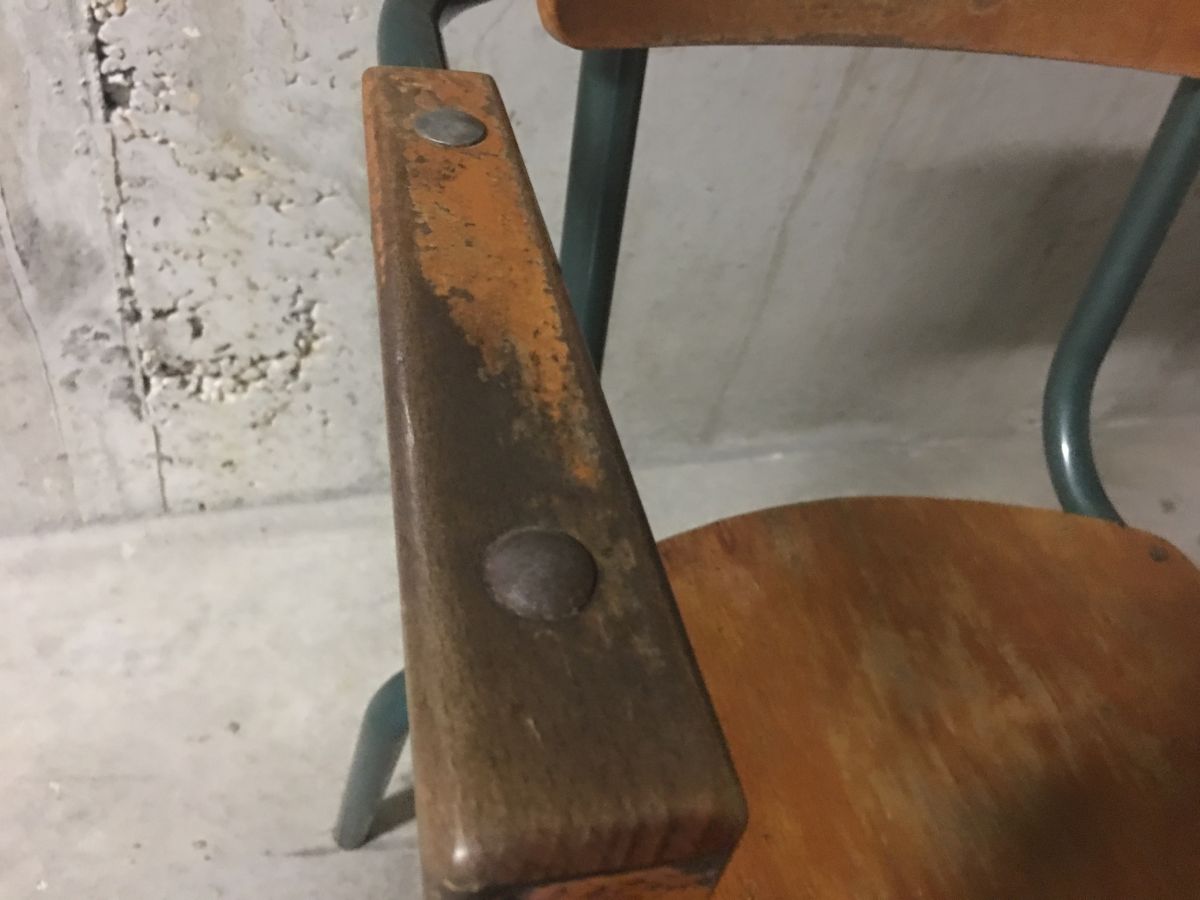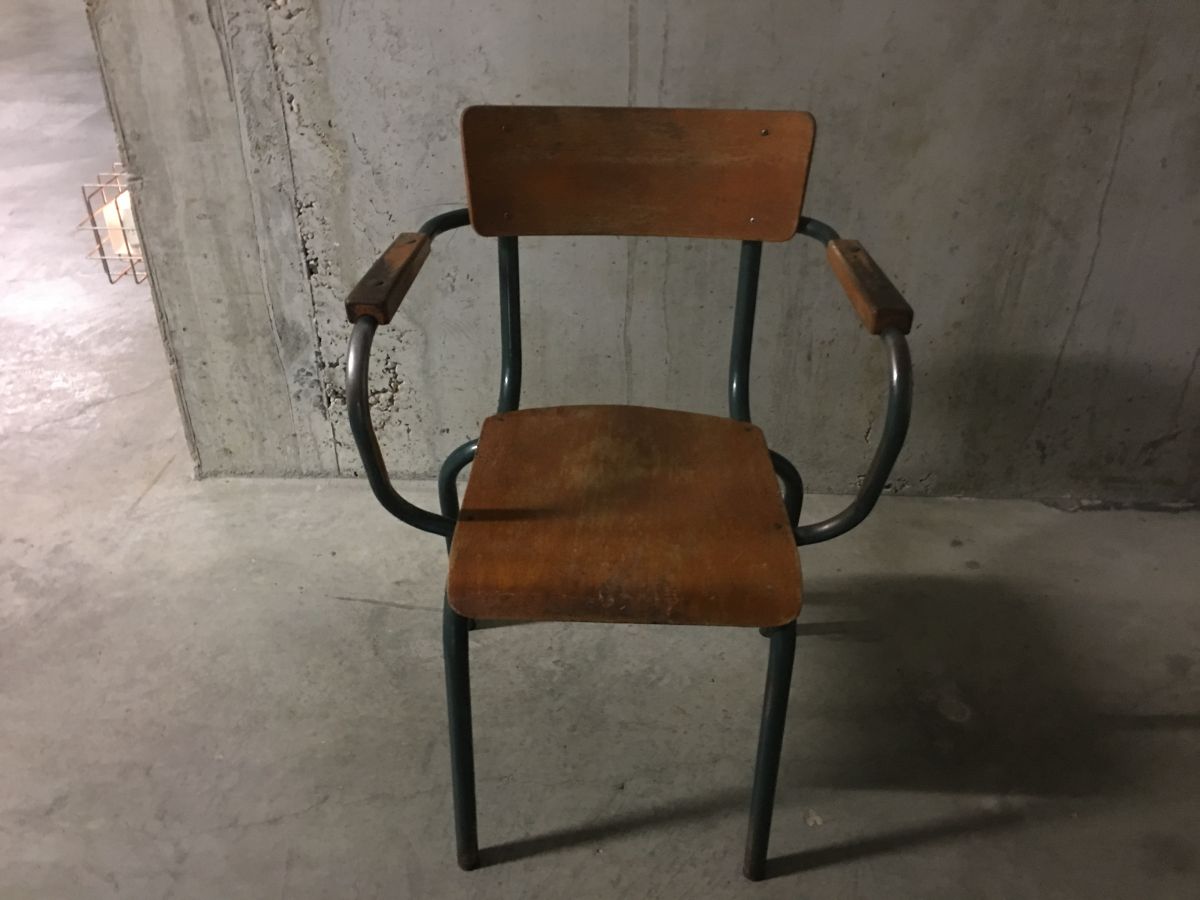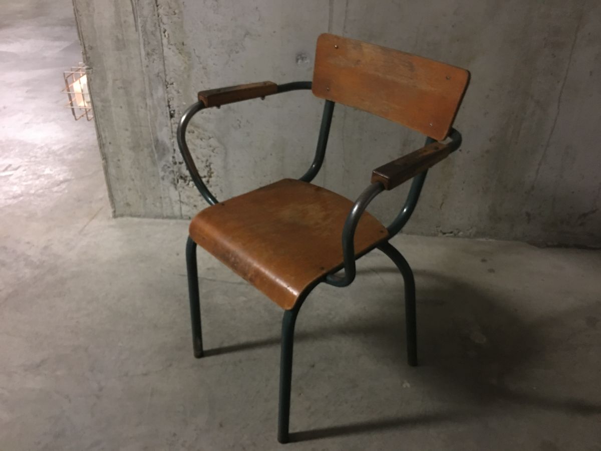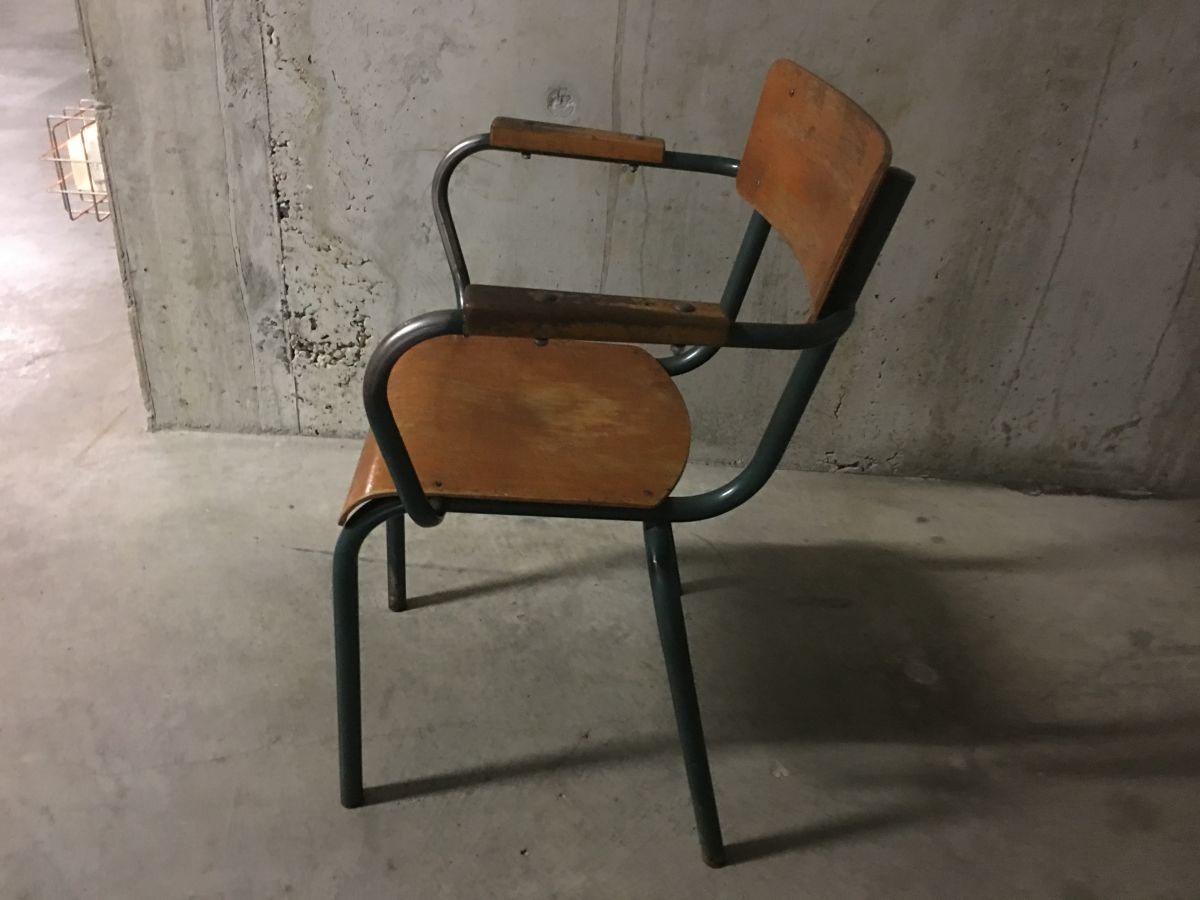 Superbe fauteuil d’instituteur des années 50, laissé volontairement dans son jus afin de conserver l’âme et la patine de la chaise, les accoudoirs en bois avaient été reboulonnés (voir photos), dimensions (cm) : L.55xH.77xP.45, hauteur assise 44cm, assise 35x35cm.