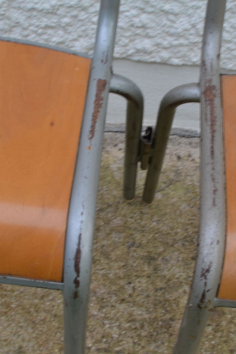 Chaises scolaires des annees 70 , modèle particulier avec système de liaisonnage permettant d’aligner les rangées et les espaces.
