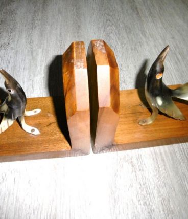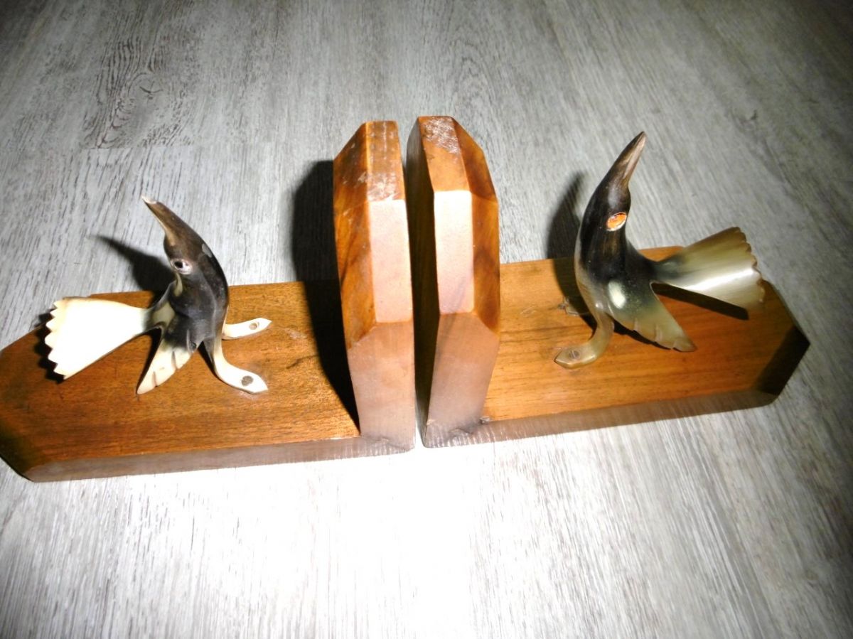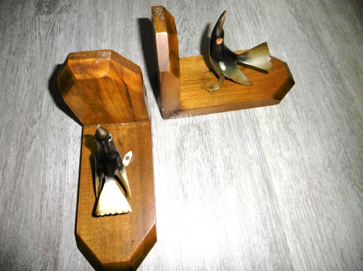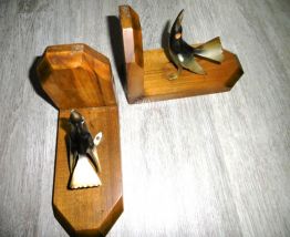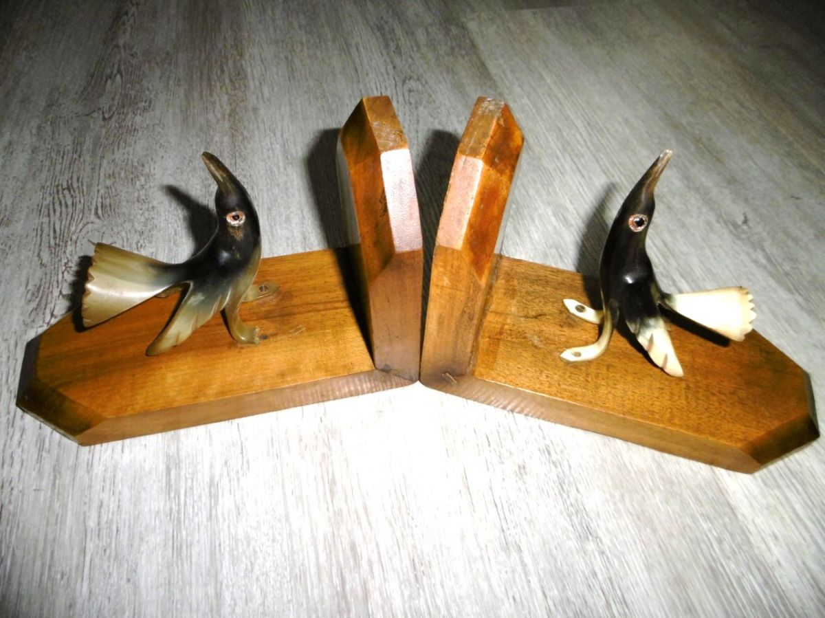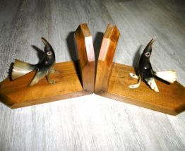 Serre-Livres Vintage 60's en bois vernis ornés d'oiseaux en corne.