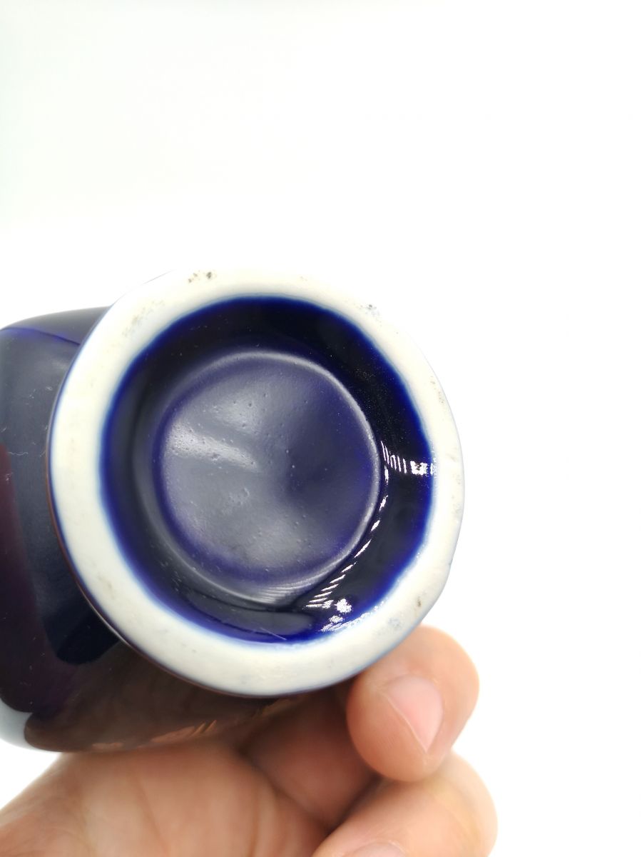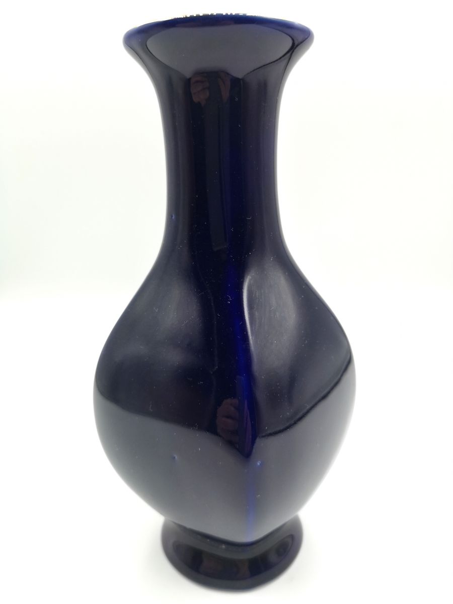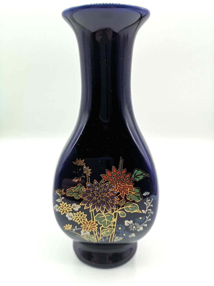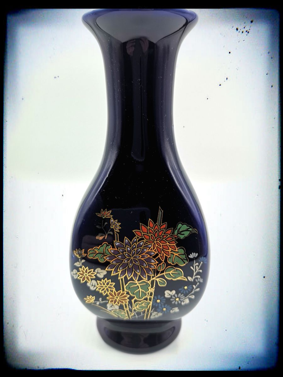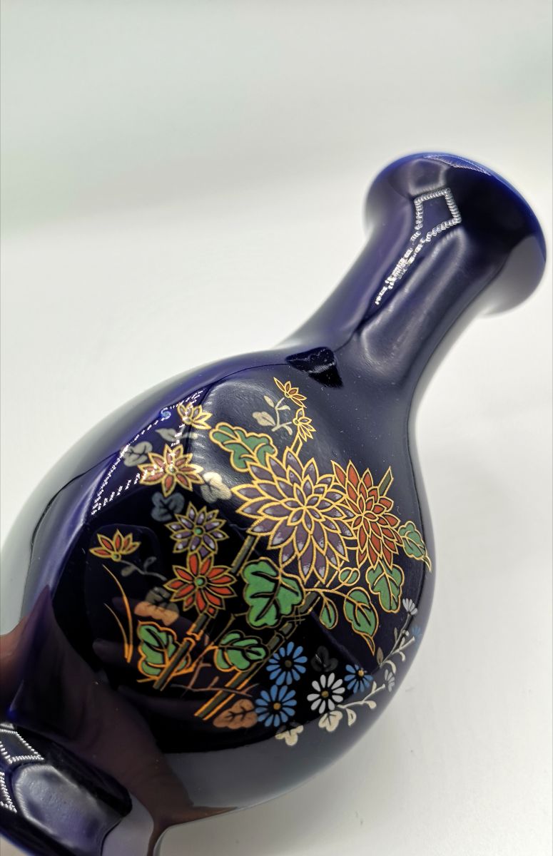 Petit vase bleu nuit 4 faces, esprit japonisant, avec joli dessin peint essentiellement doré. Le dessin représente des fleurs, rappelant les estampes japonaises, asiatiques.