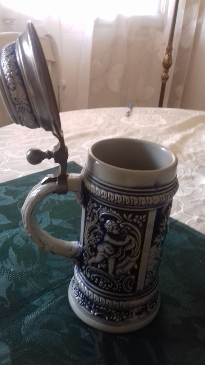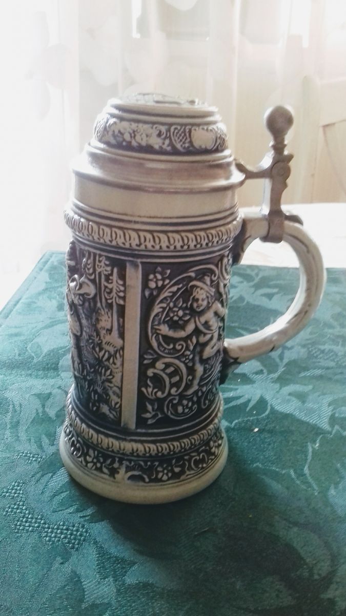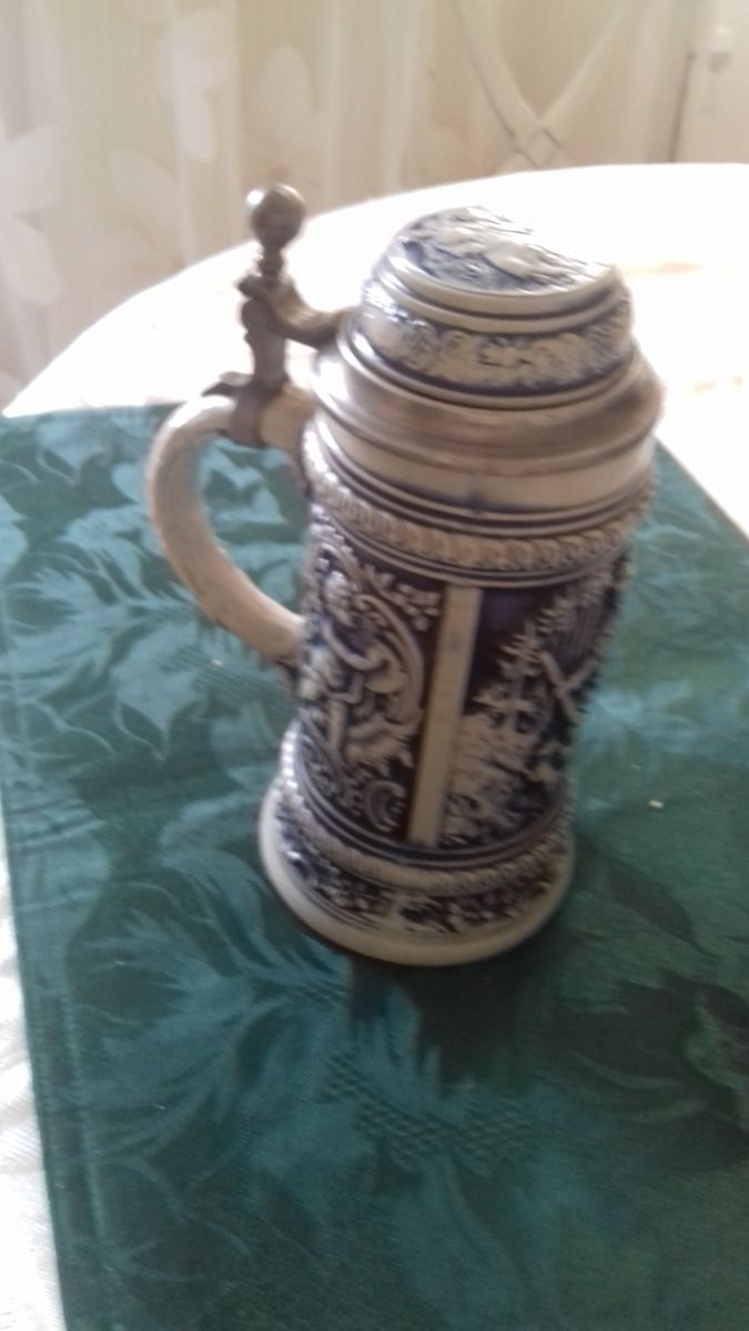 Belle chope allemande;milieu 19e;motifs bleus sur grès beige;parfait état.chasse et amour.