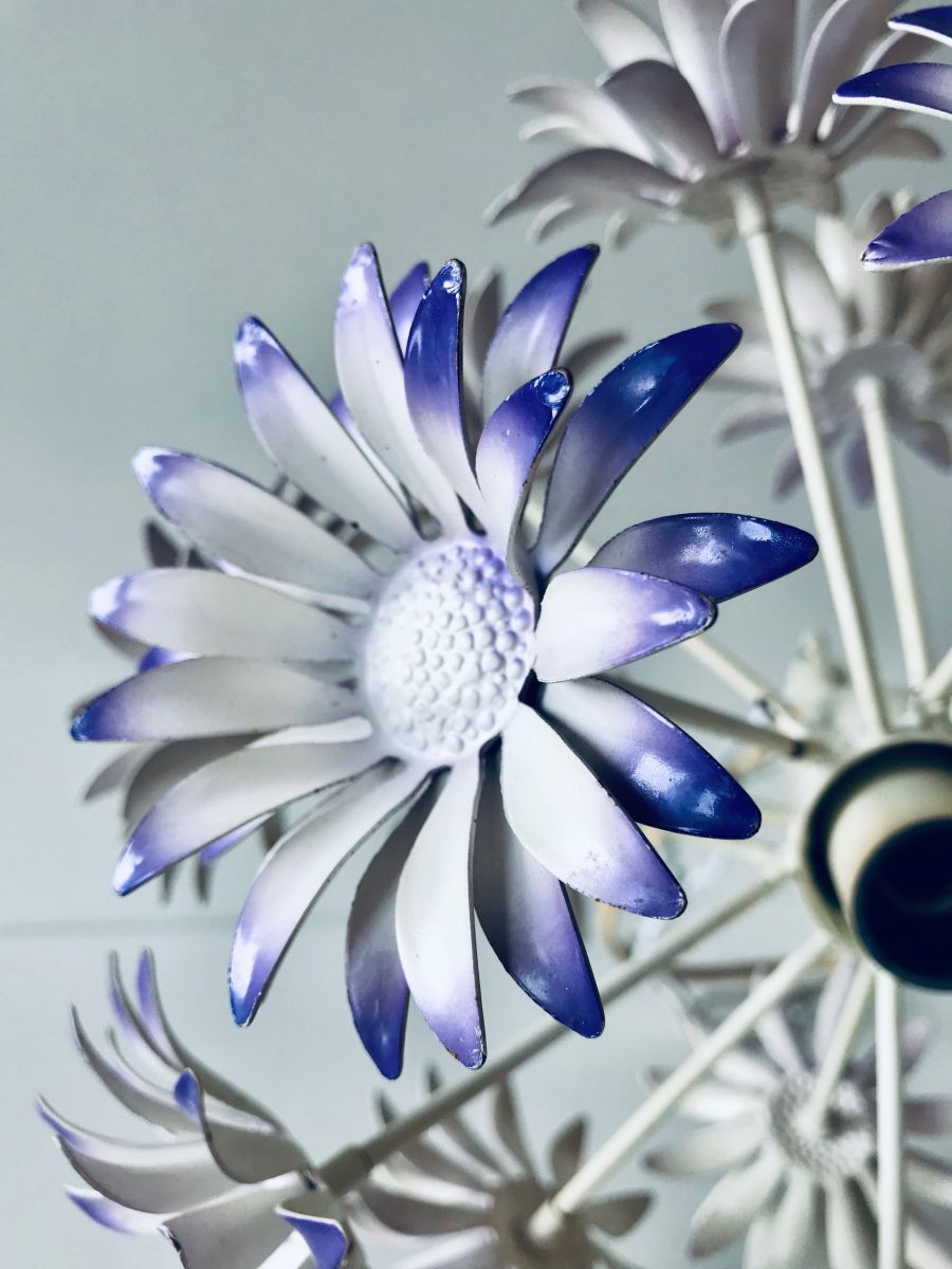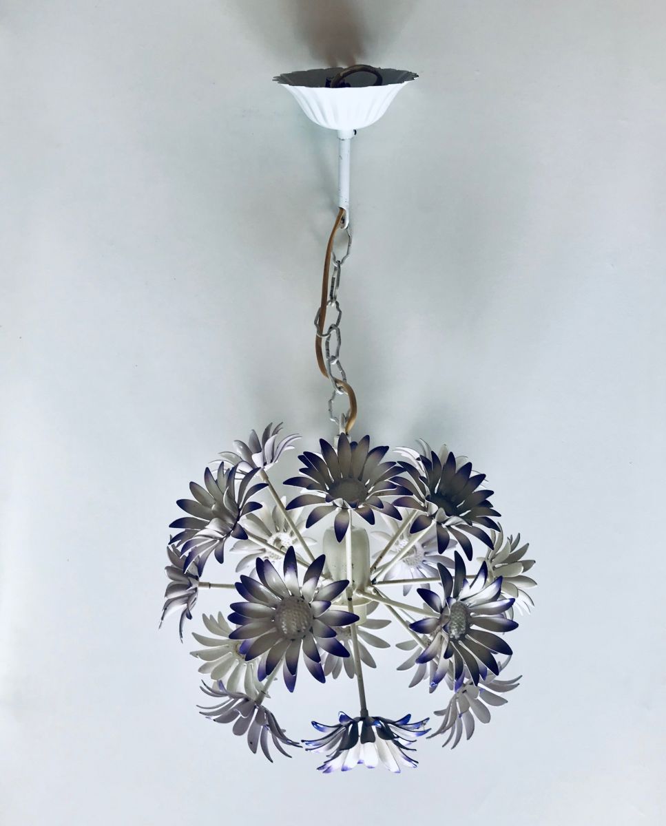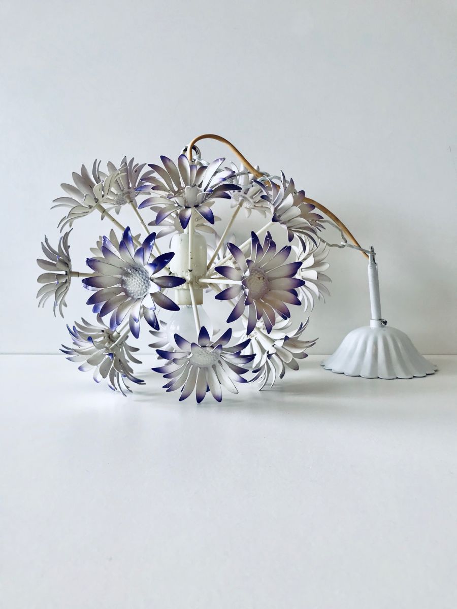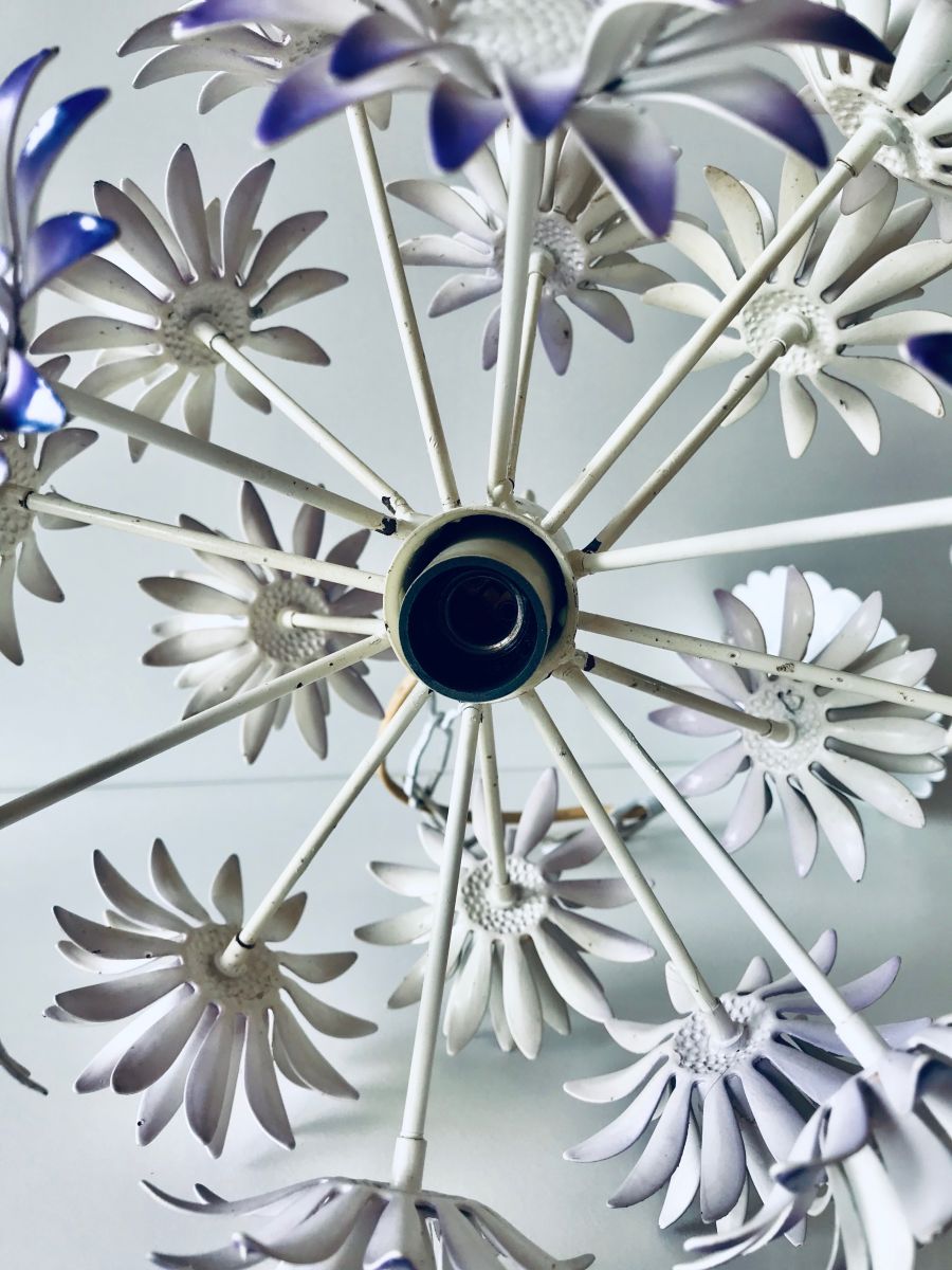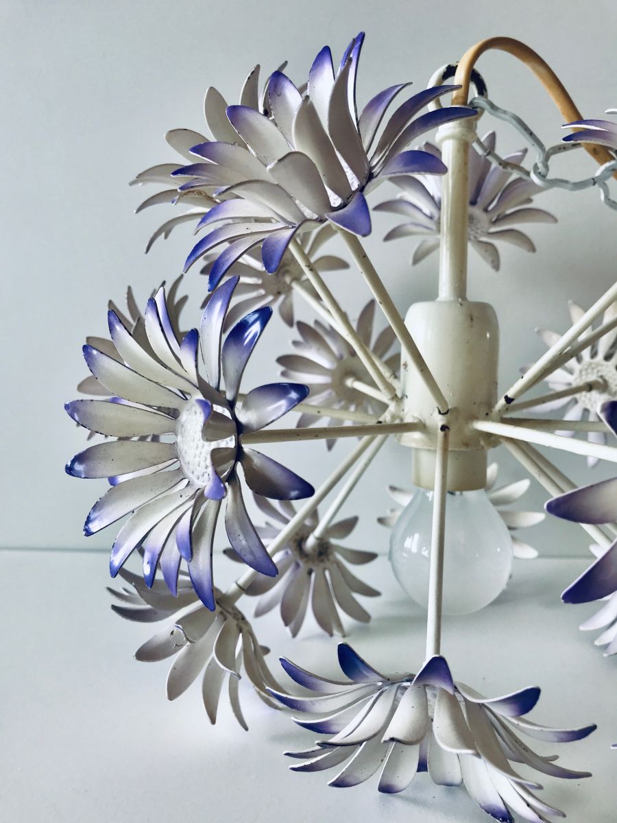 Sublime et originale suspension luminaire vintage en métal représentant un bouquet de fleurs violettes. À la fois pétillant et aérien ce luminaire rare ne manquera pas de vous séduire. Il sera parfait dans une chambre d’enfant ou un salon. Les touches colorées violettes sur les pointes des pétales sont discrètes et apportent de la profondeur et du peps à l’ensemble du luminaire.